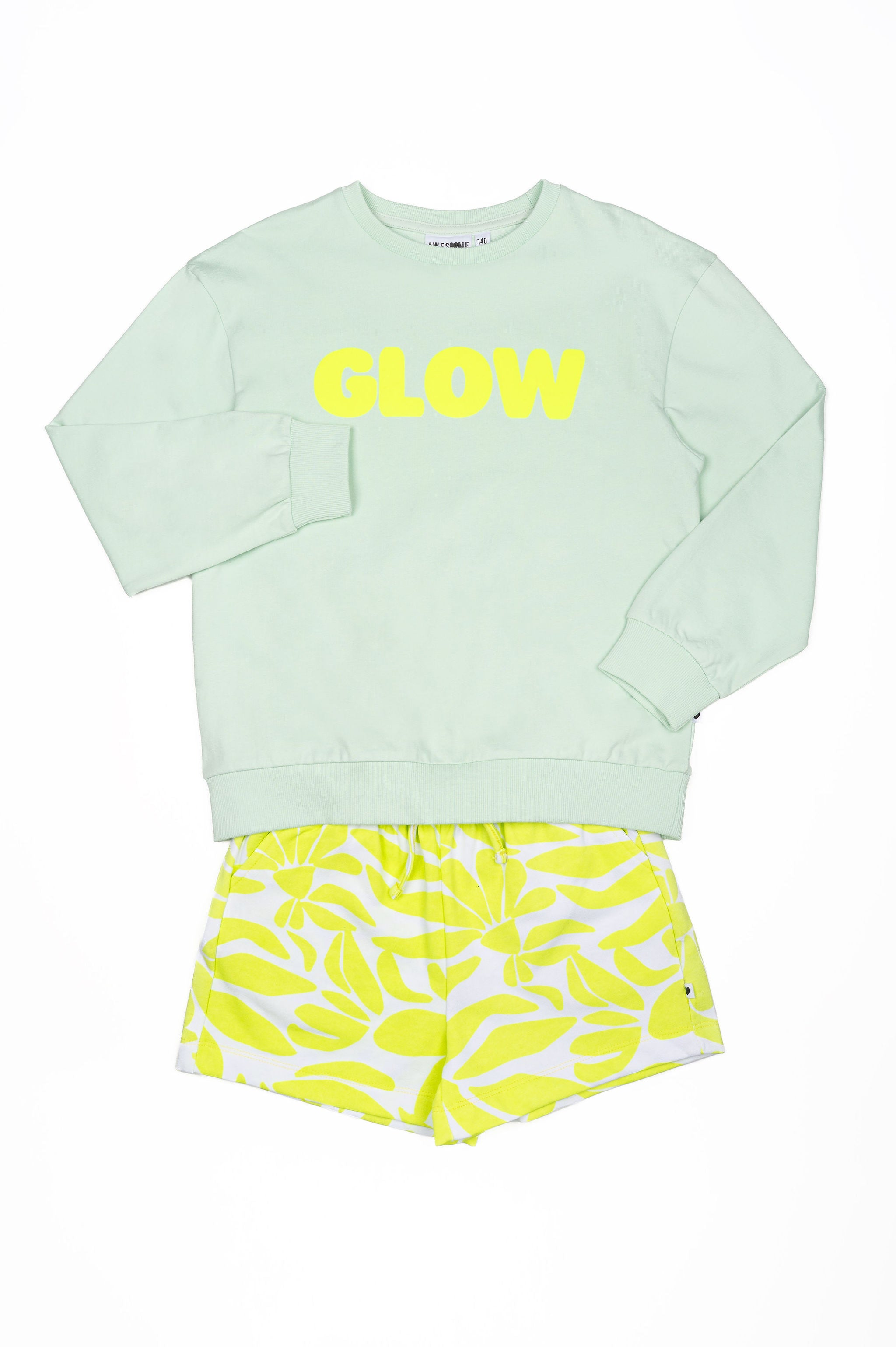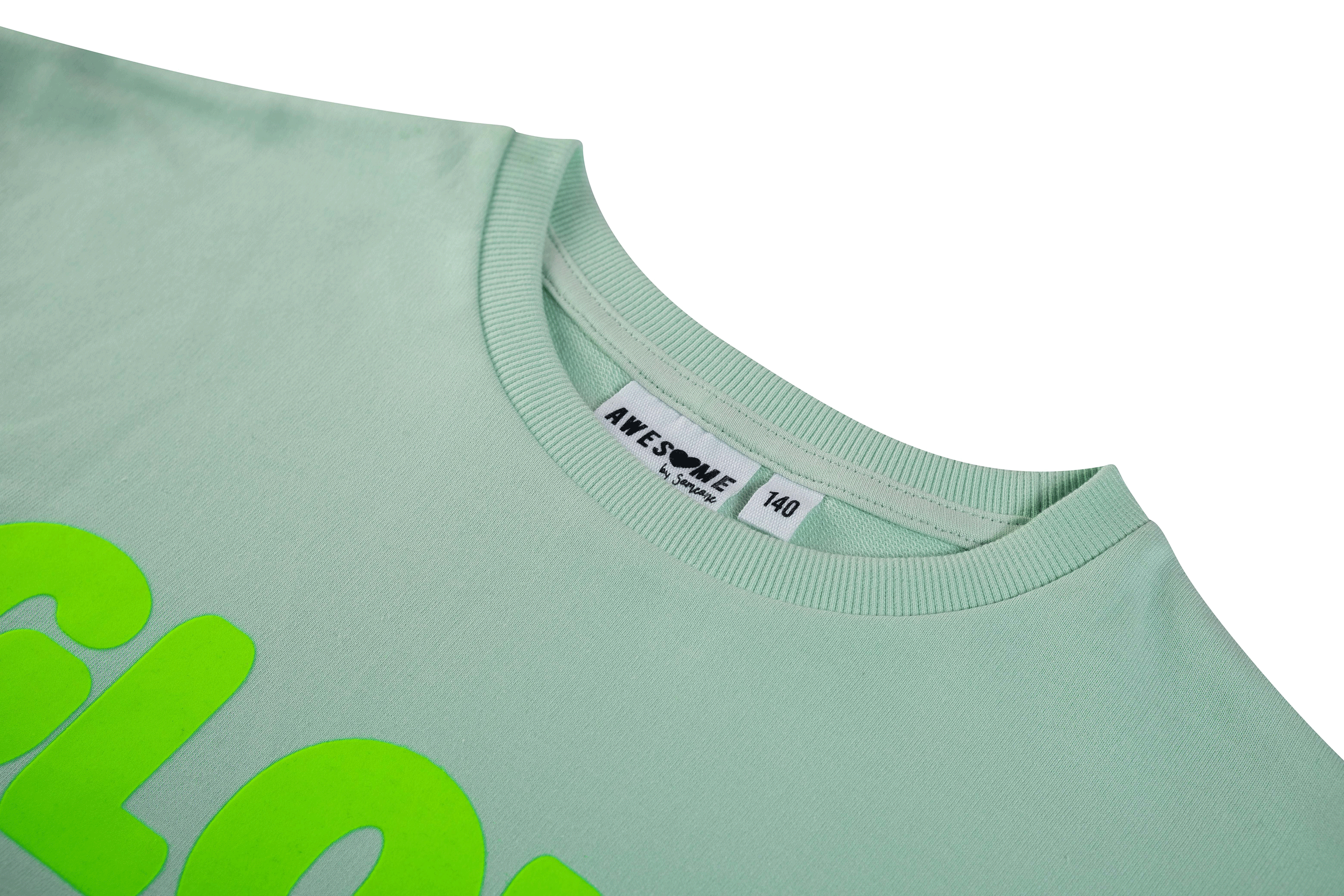 A fresh and modern sweatshirt that instantly stands out! This mint green sweater features the word GLOW in bright green letters on the chest, giving it a bold and energetic look. Perfect for school days, relaxed weekends, or sporty moments. Easy to pair with jeans, leggings, or comfy trousers for a striking yet casual outfit.