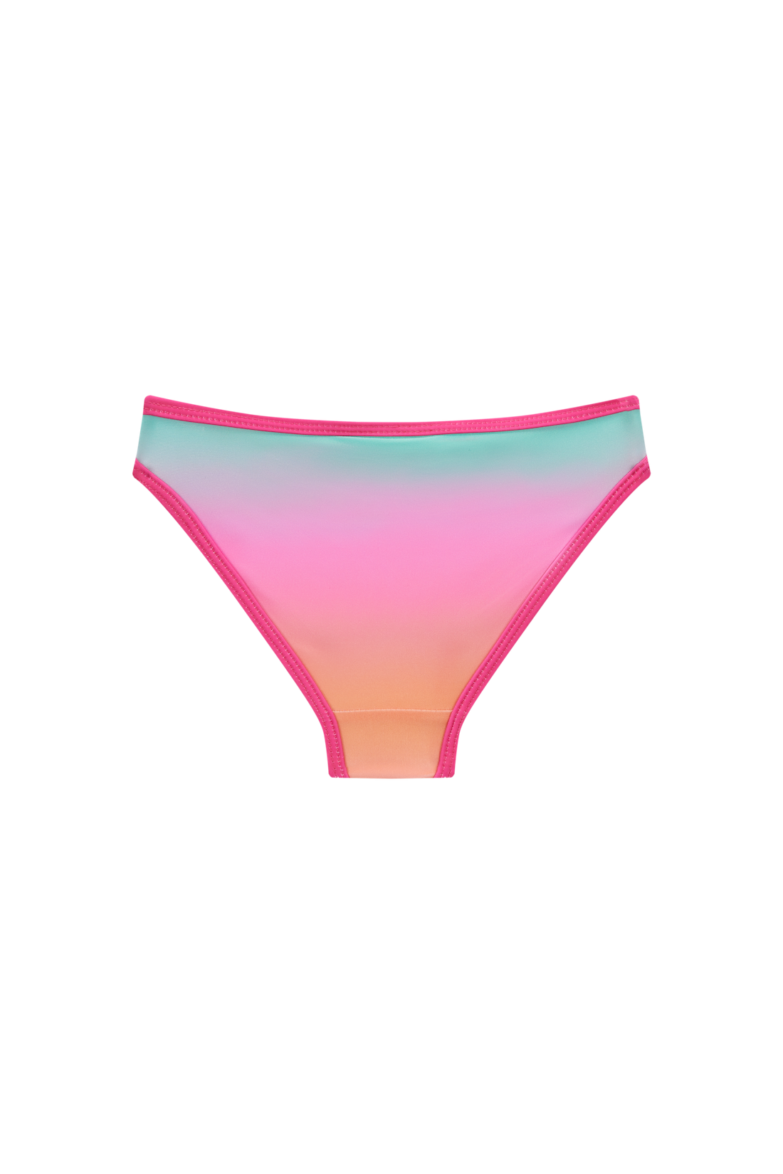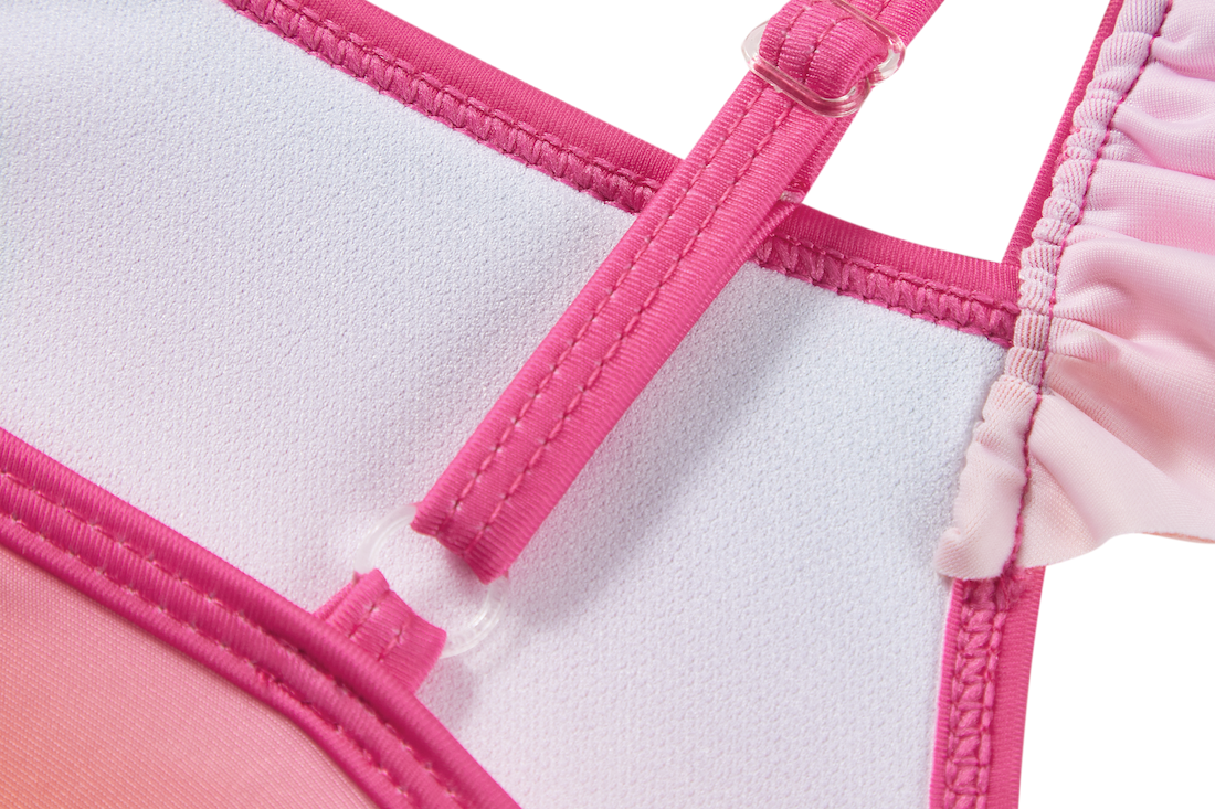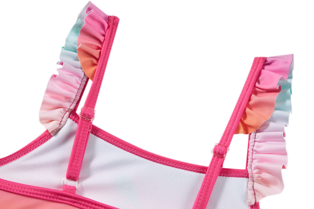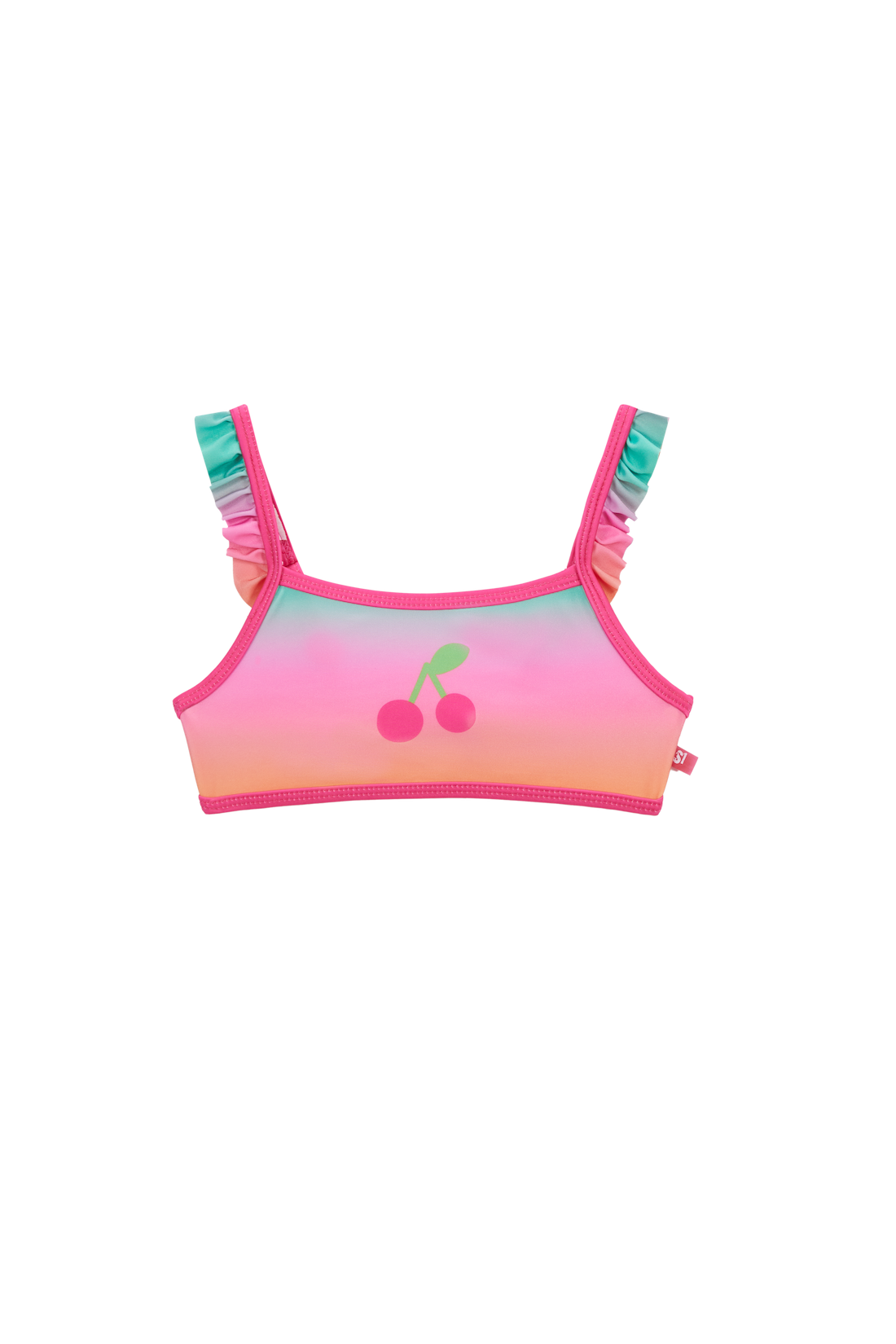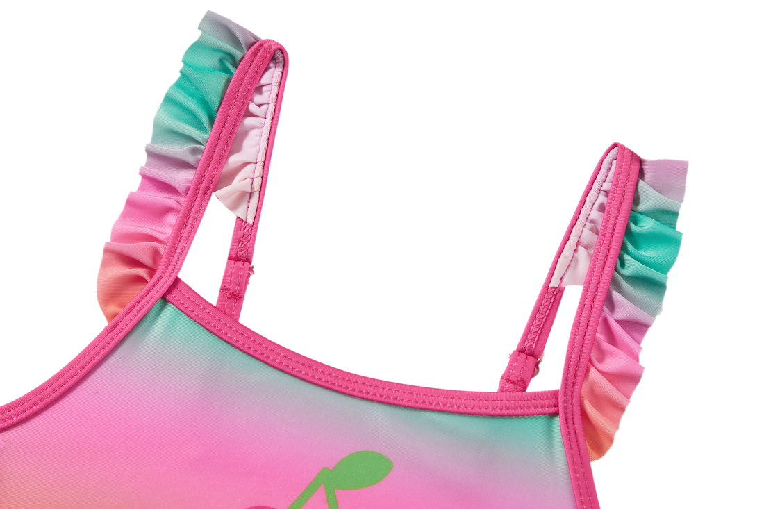 This cheerful bikini top stands out with its soft rainbow shades and the little cherry detail in the centre. The ruffled shoulder straps add a playful touch. A perfect piece for kids who love colour and fun by the water.