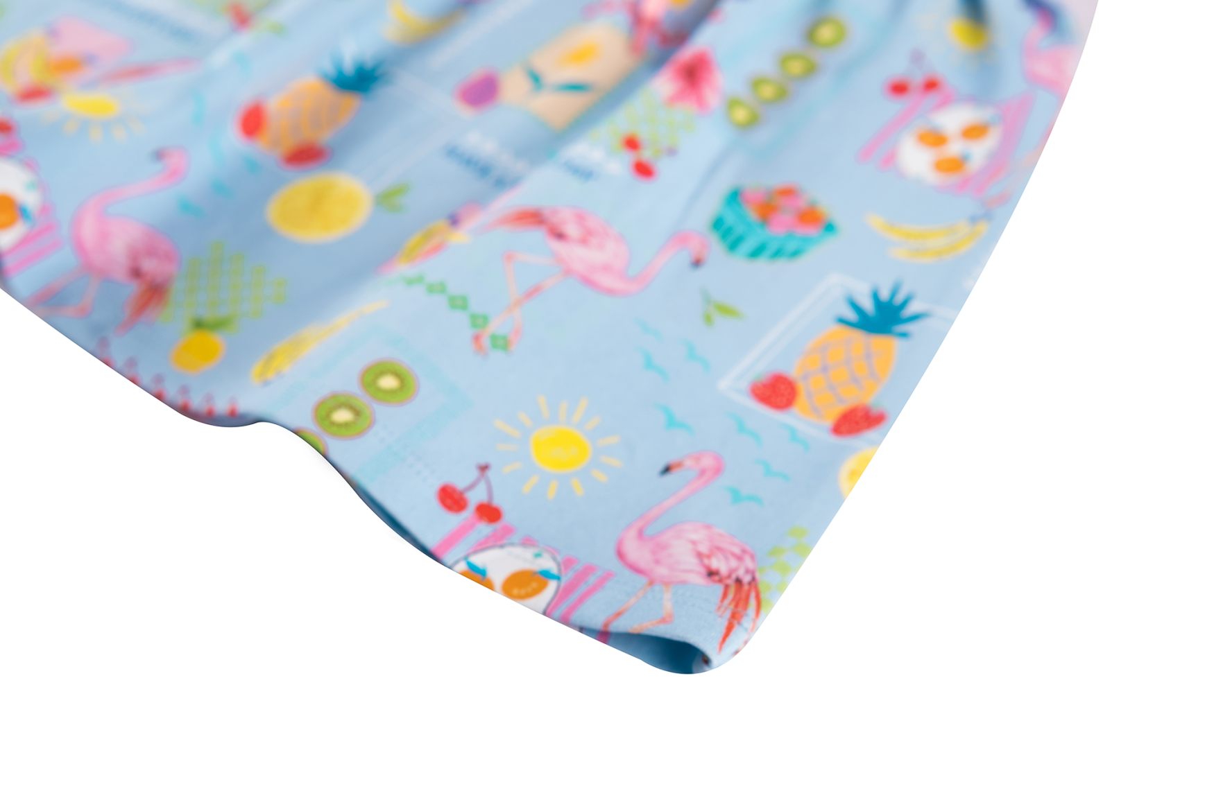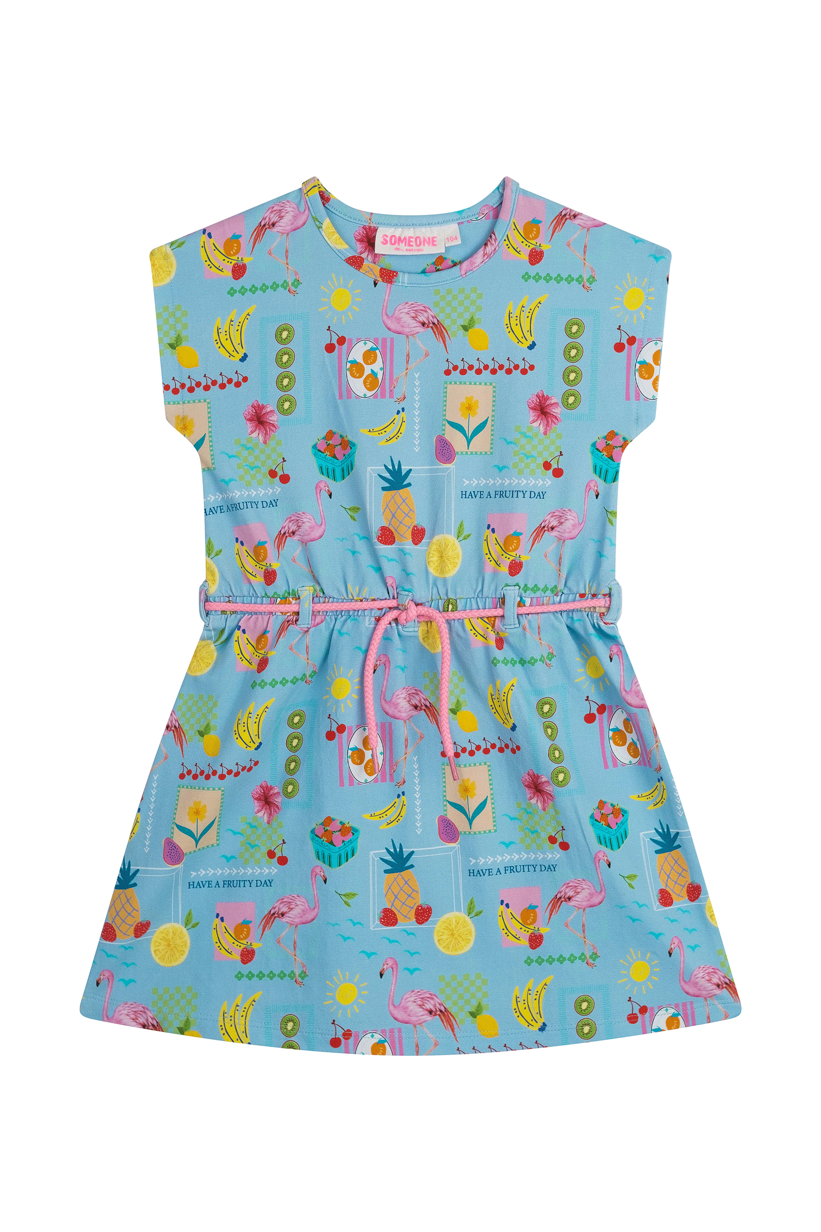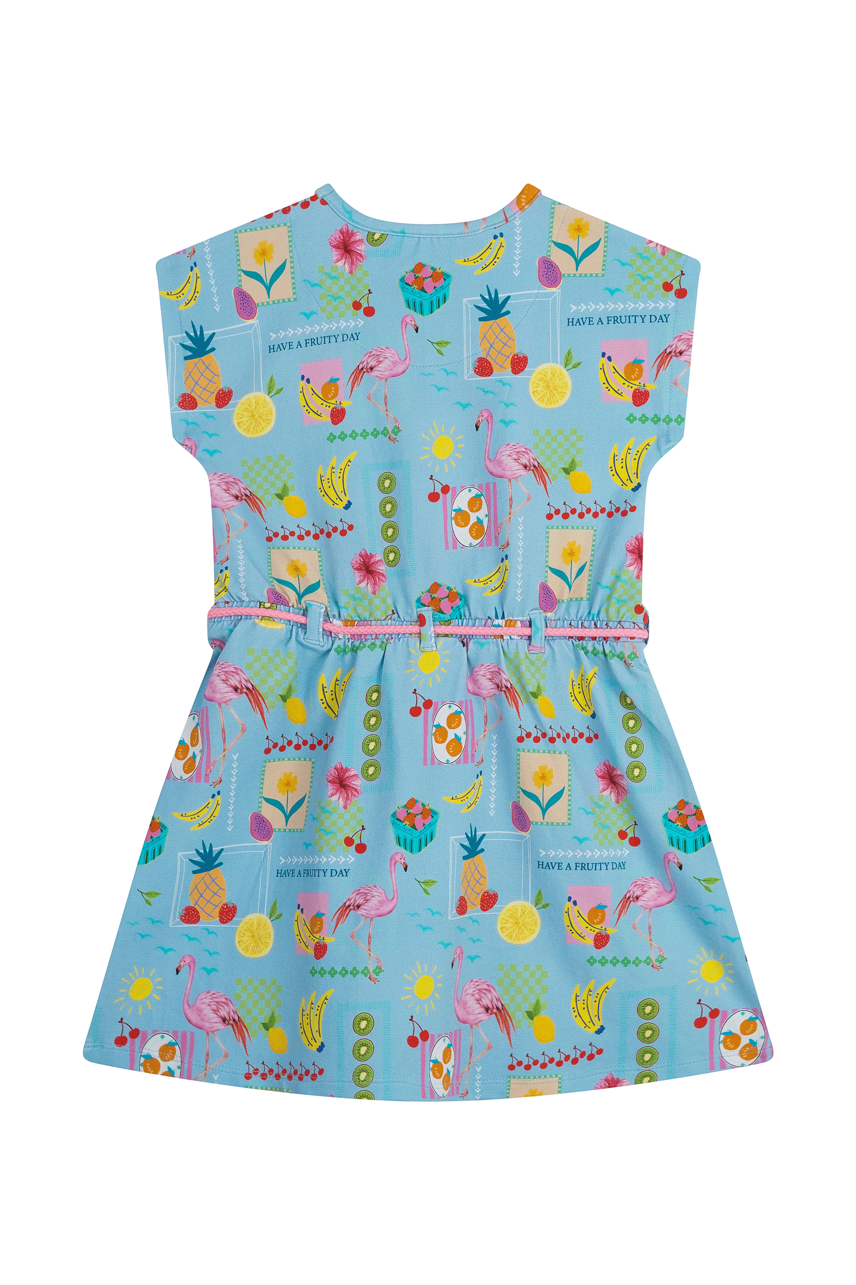 A cheerful summer dress bursting with colour and fun. The bright blue background is covered with flamingos, fruit, suns and small playful illustrations that bring an instant holiday vibe. The pink waist cord lets you adjust the fit, keeping it comfy throughout the day. Made from a soft, lightweight fabric, it’s perfect for warm weather, beach days or any playful adventure.