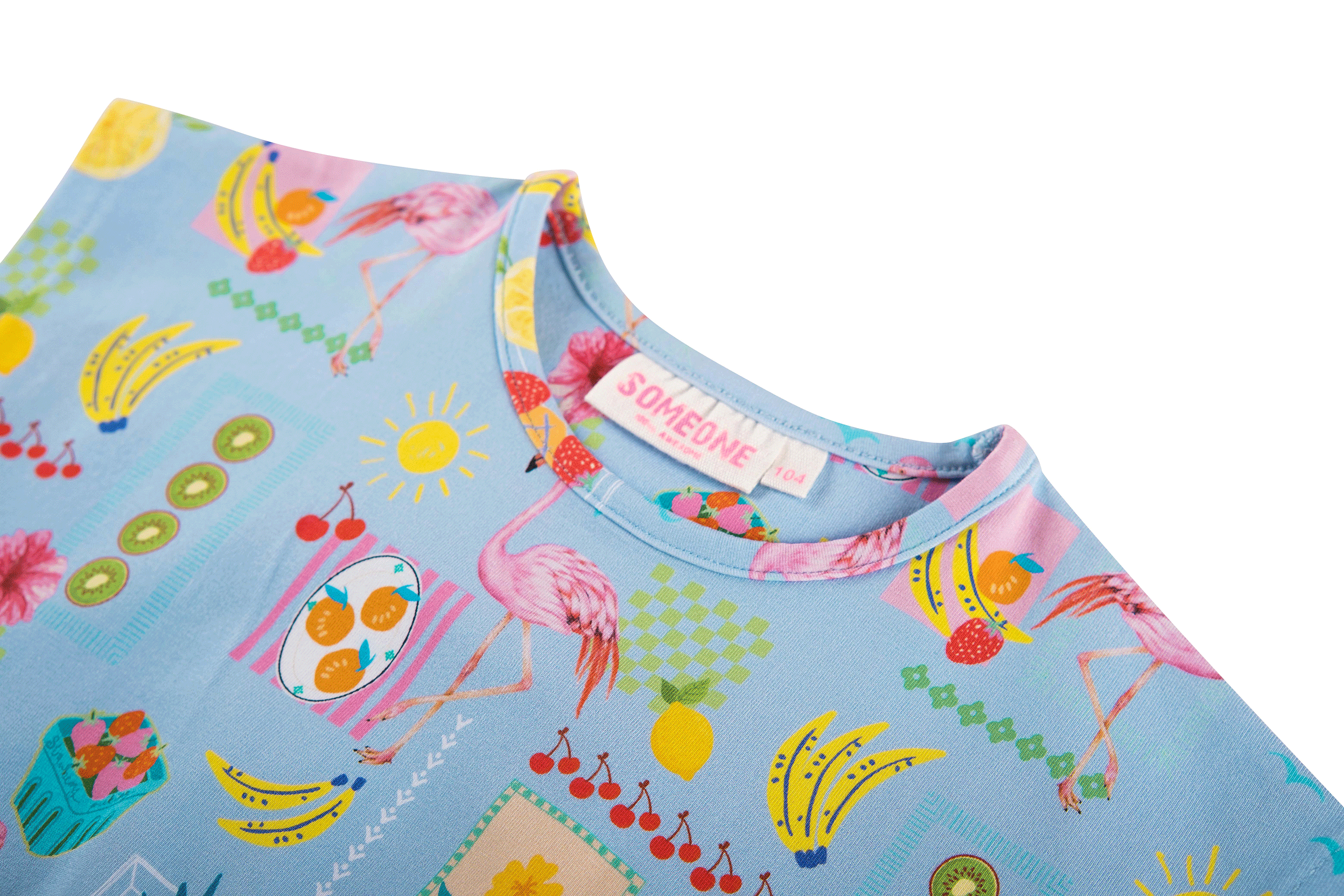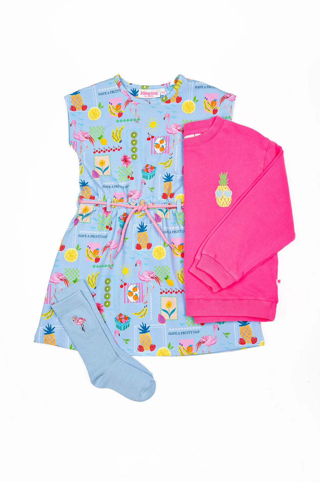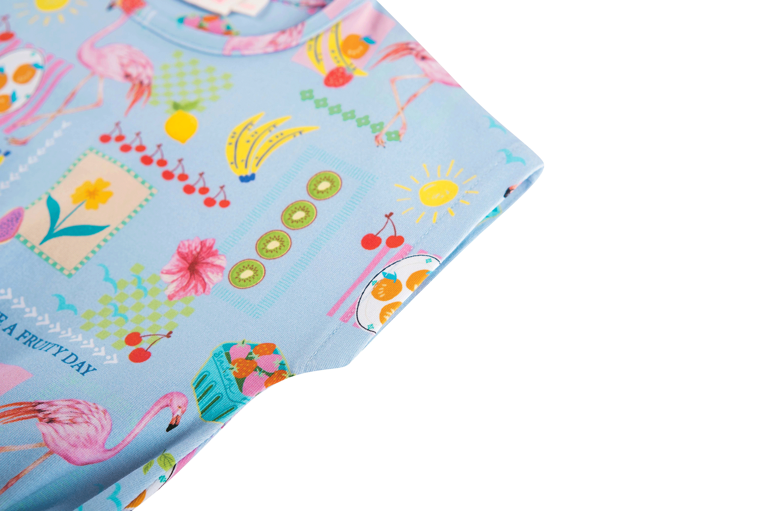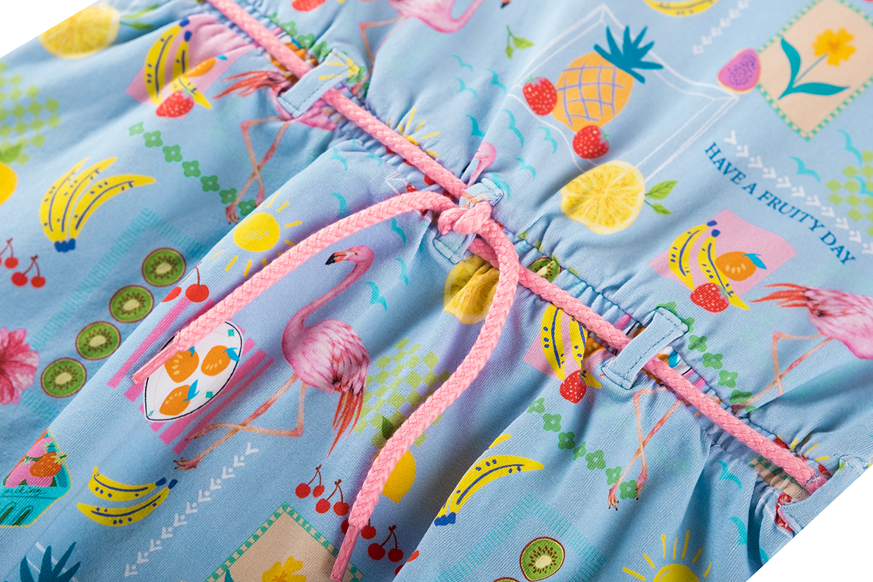 A cheerful summer dress bursting with colour and fun. The bright blue background is covered with flamingos, fruit, suns and small playful illustrations that bring an instant holiday vibe. The pink waist cord lets you adjust the fit, keeping it comfy throughout the day. Made from a soft, lightweight fabric, it’s perfect for warm weather, beach days or any playful adventure.