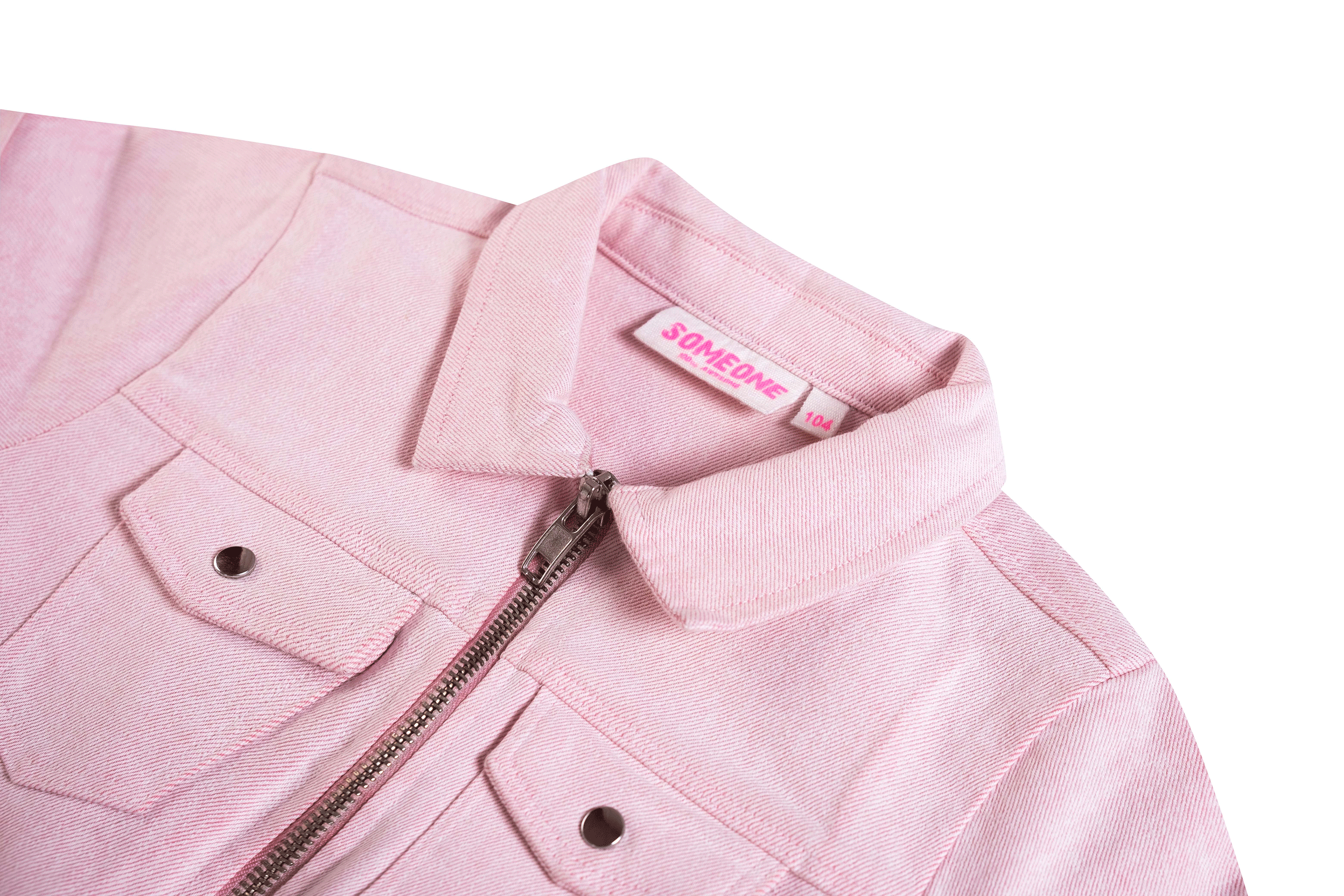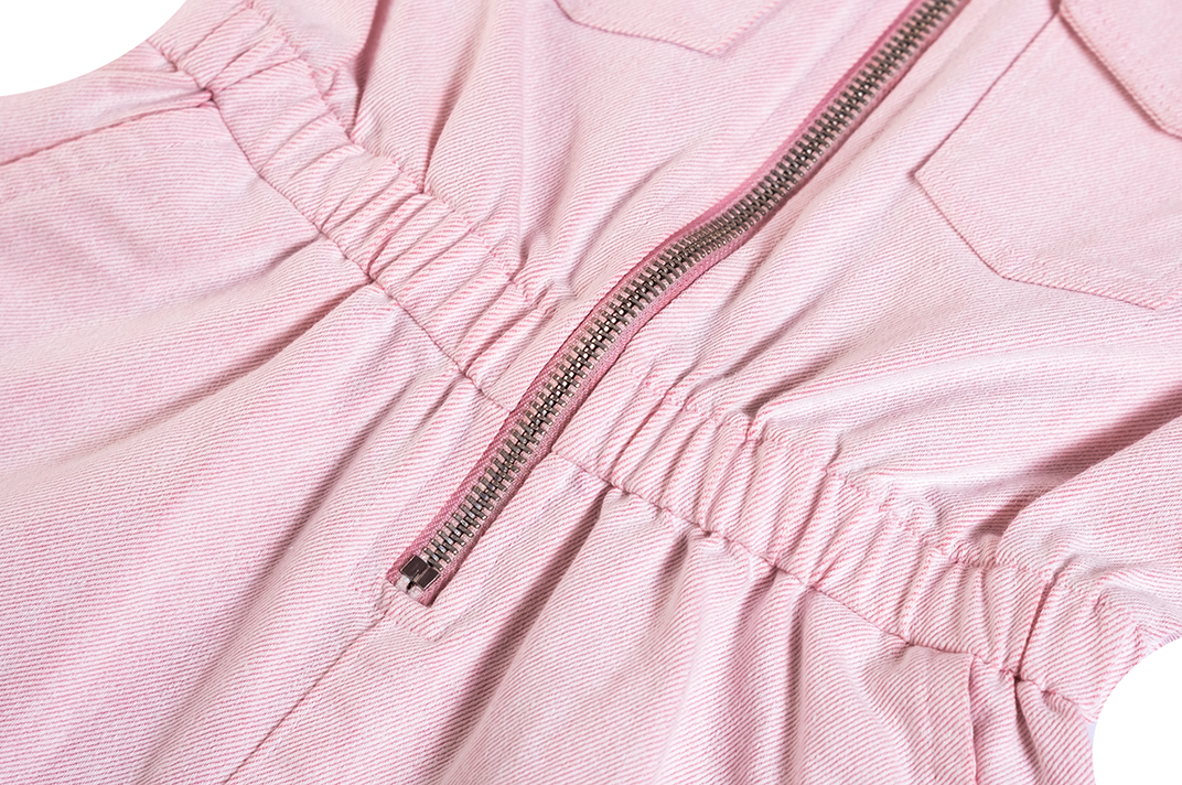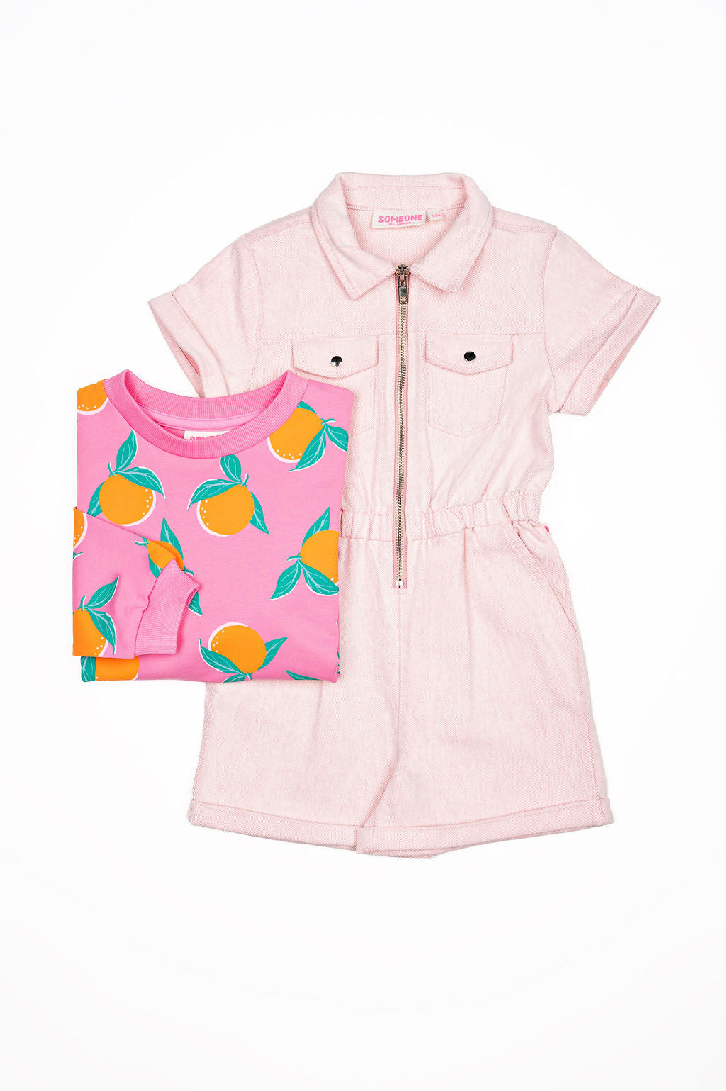 A soft pink short-sleeved jumpsuit with a neat collar and a practical front zipper. The buttoned chest pockets add a touch of attitude, and the elastic waistband keeps the fit comfortable and flattering. Perfect for days when your child wants an easy, stylish outfit.