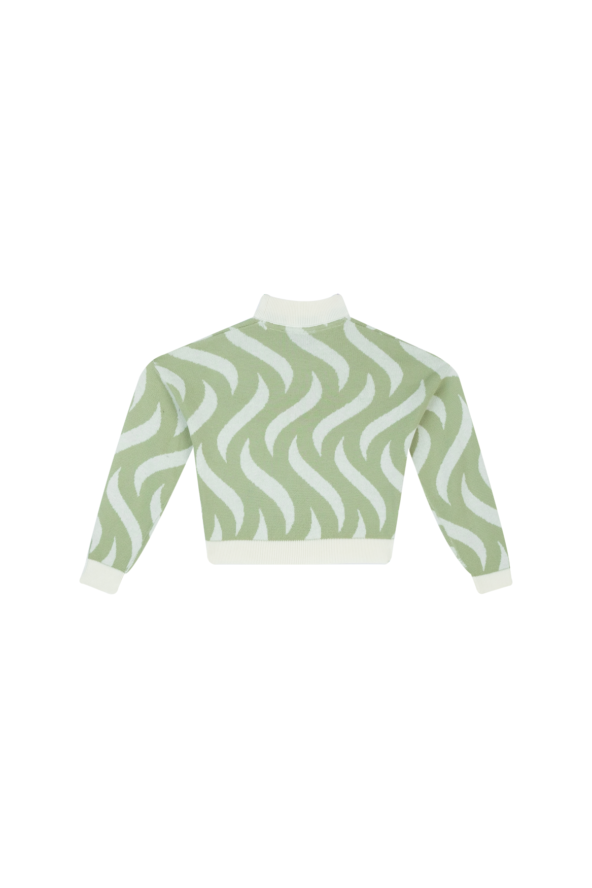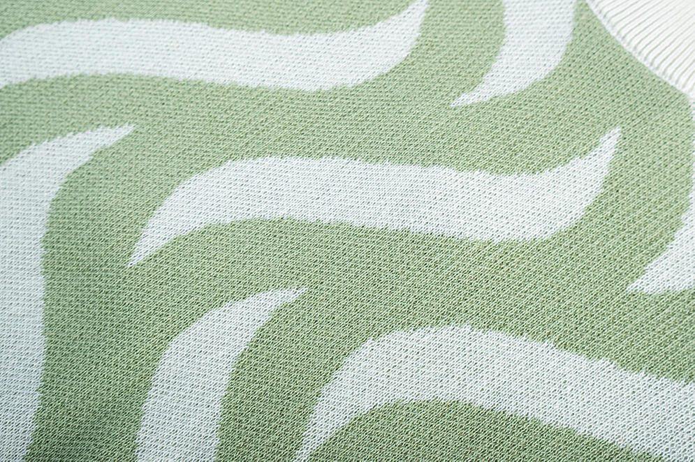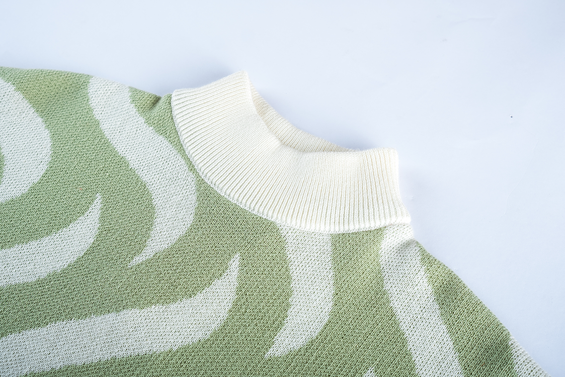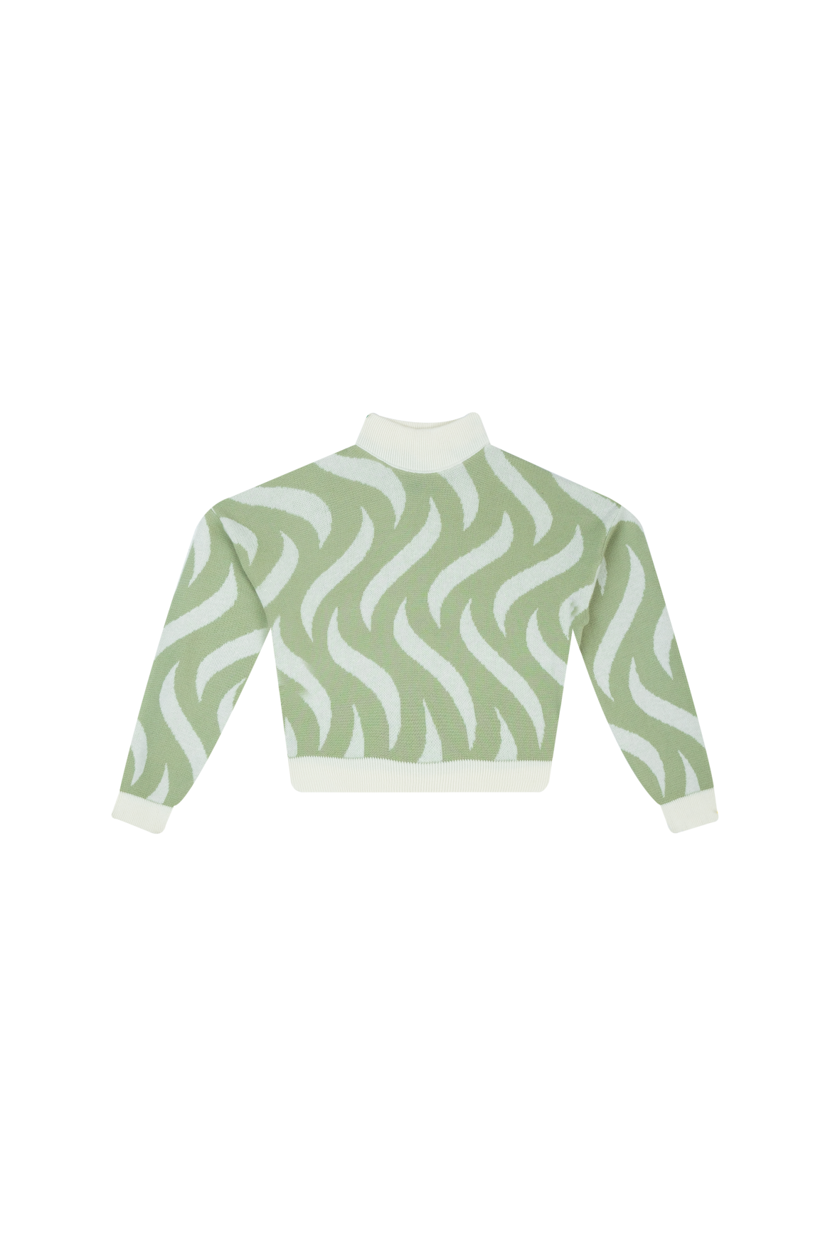 This light green turtleneck sweater with a flowing, abstract pattern is a stylish and modern addition to any wardrobe. The playful design gives the sweater a fresh and unique look, while the comfortable fit makes it perfect for everyday wear. The high turtleneck and contrasting hems provide a clean and contemporary finish. Perfect to pair with jeans, a skirt, or a cozy winter outfit.