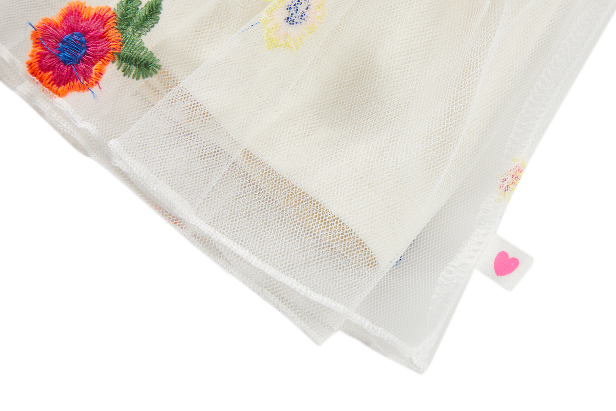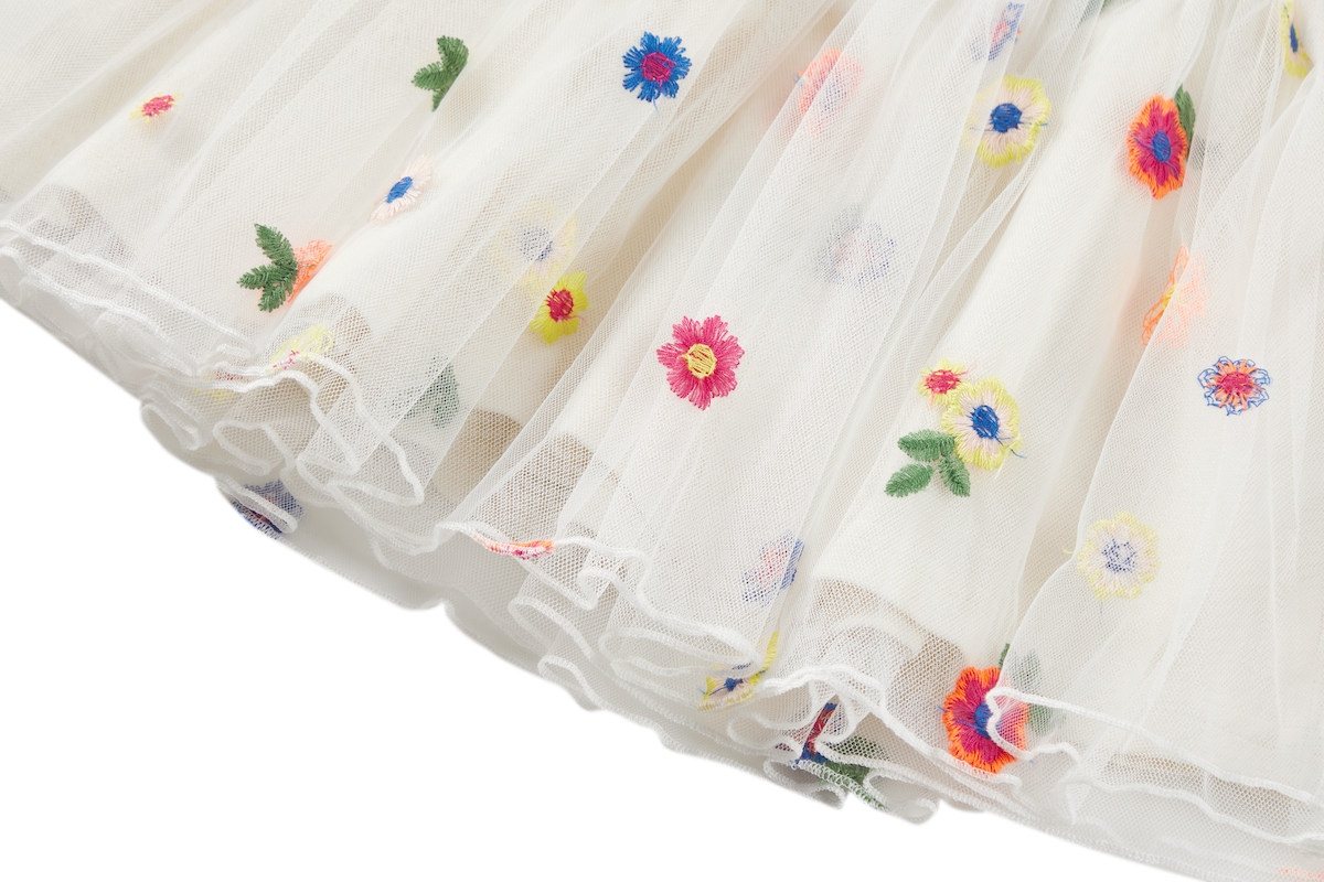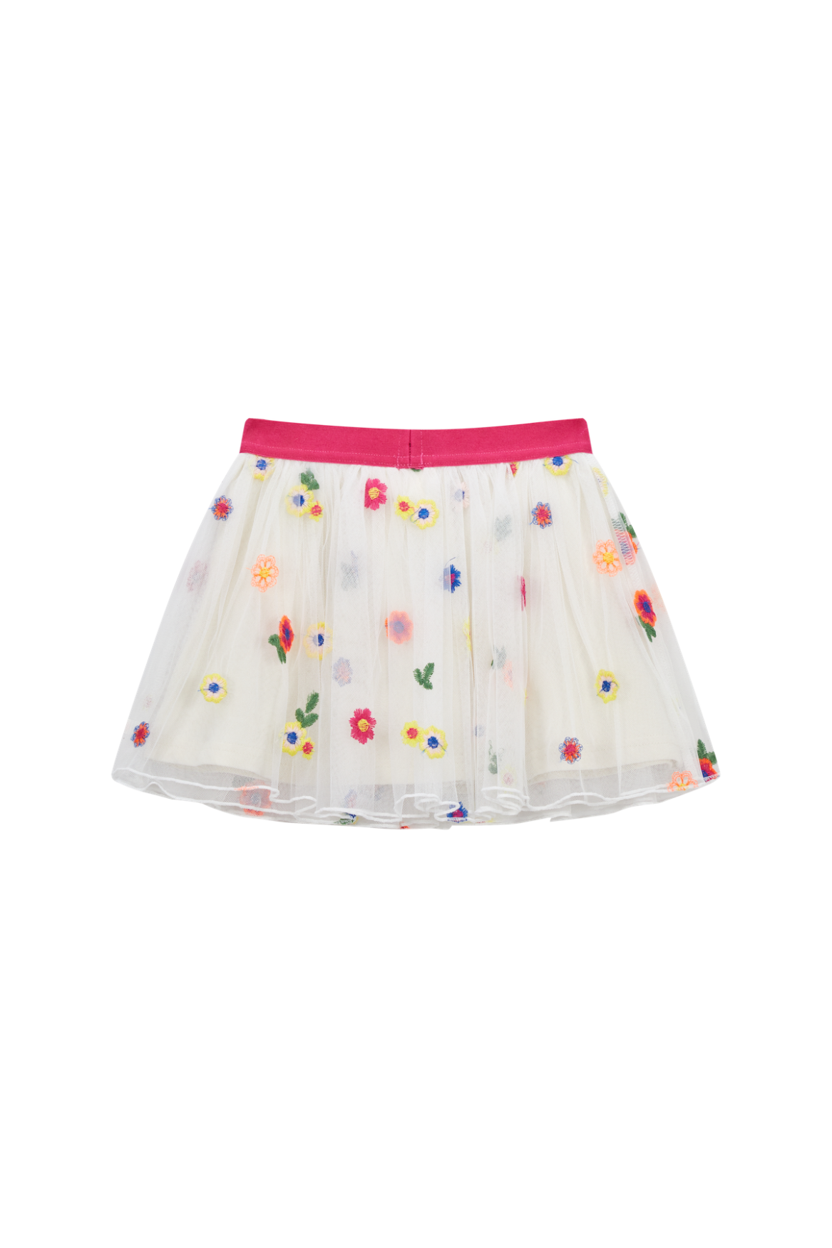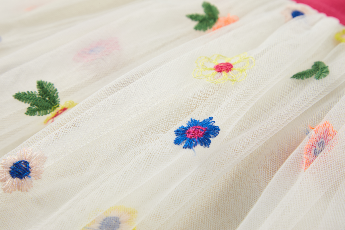 This airy tulle skirt has a festive feel thanks to the colourful flowers scattered all over it. The bright fuchsia waistband adds a playful touch and keeps the fit comfortable. A cheerful, dreamy little skirt, perfect for kids who love a splash of colour and imagination.