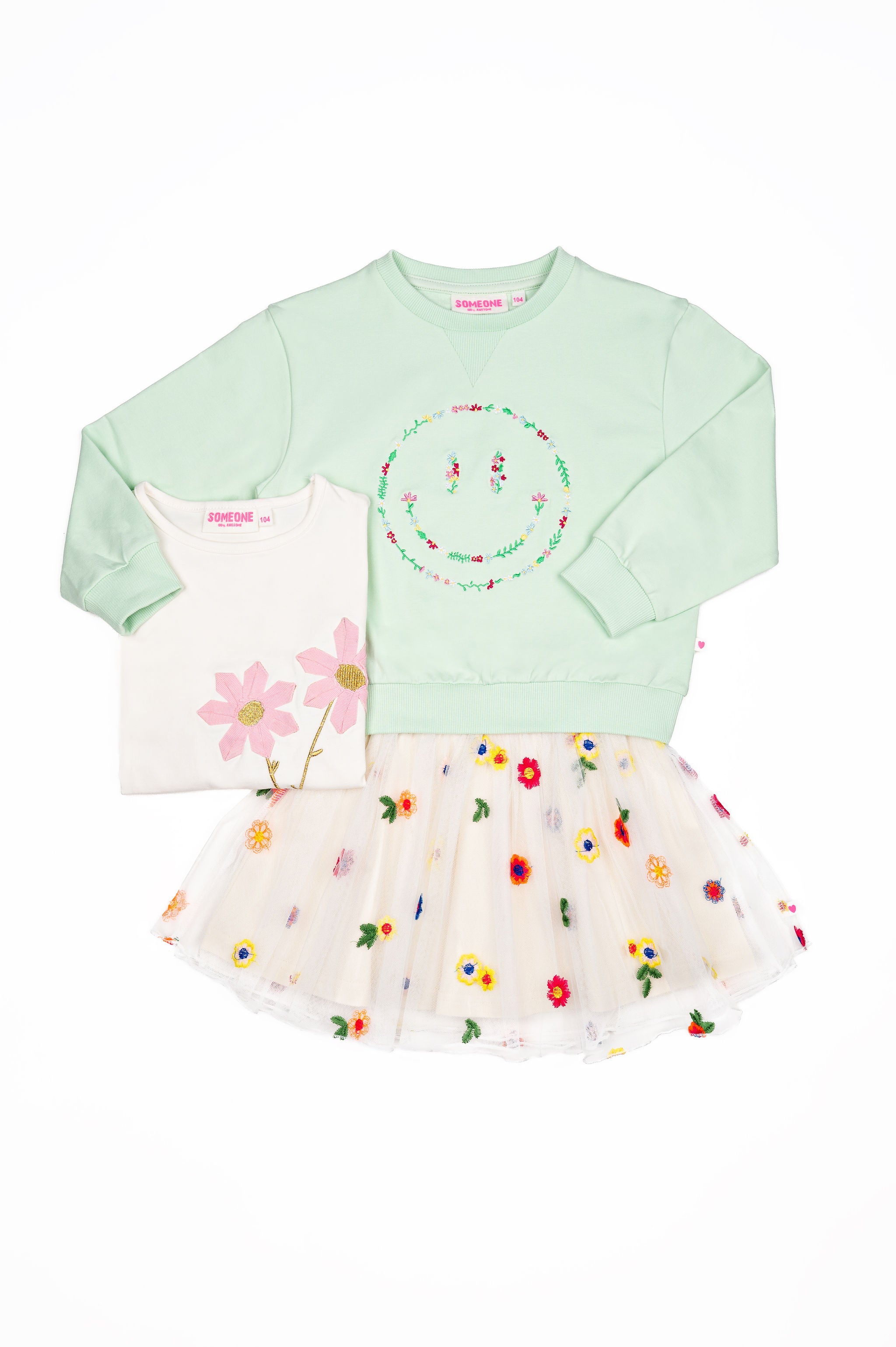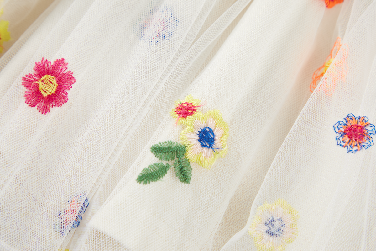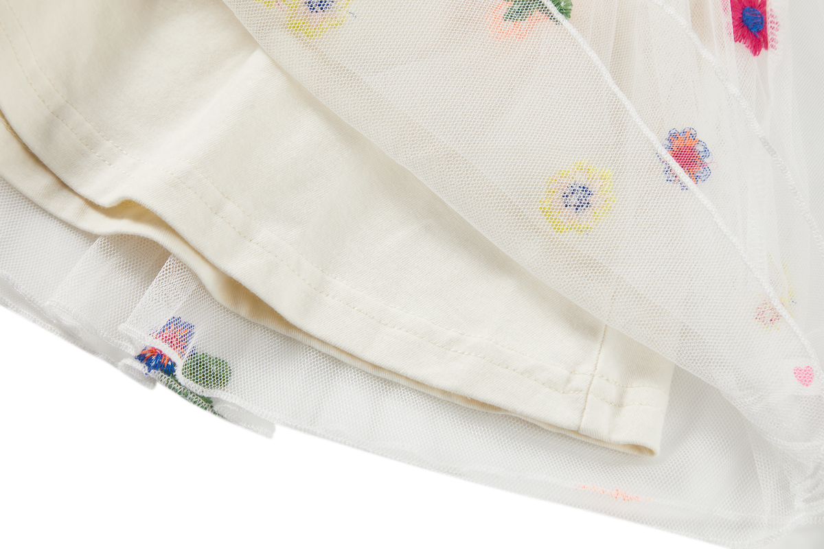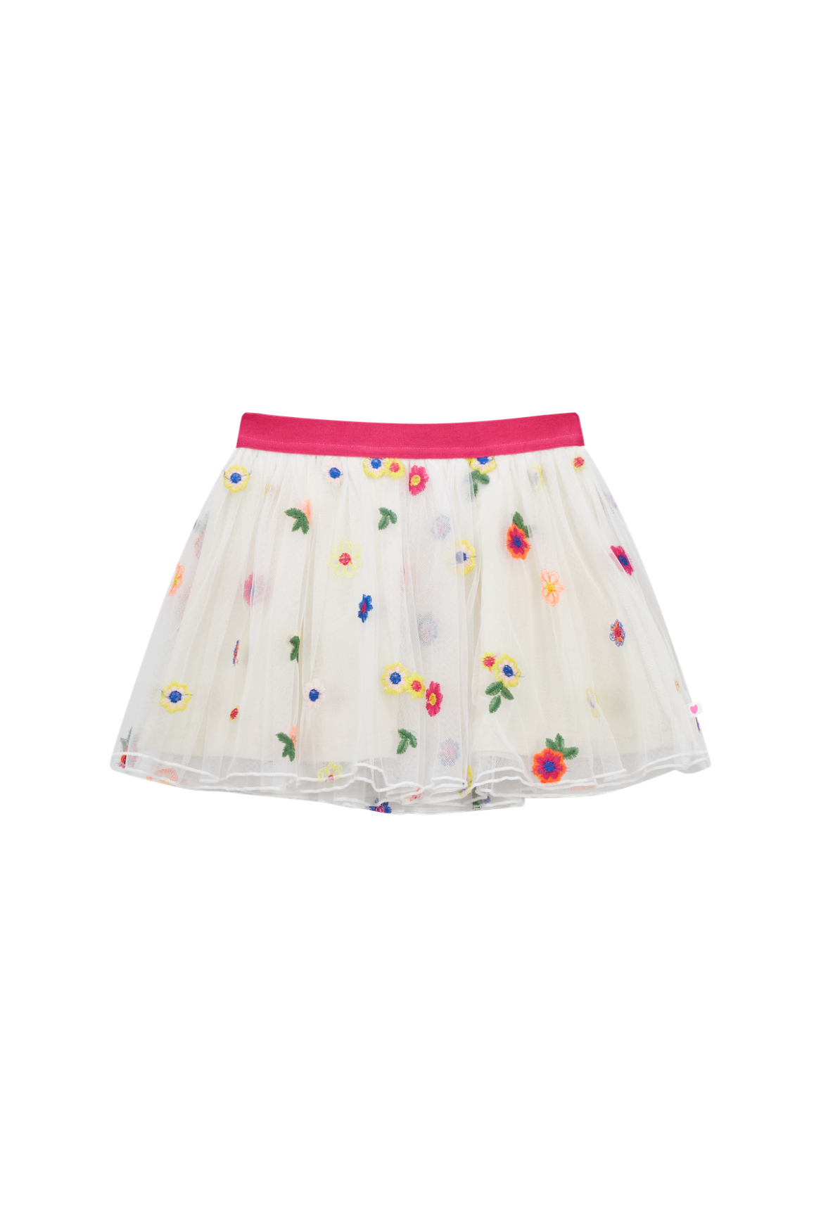 This airy tulle skirt has a festive feel thanks to the colourful flowers scattered all over it. The bright fuchsia waistband adds a playful touch and keeps the fit comfortable. A cheerful, dreamy little skirt, perfect for kids who love a splash of colour and imagination.