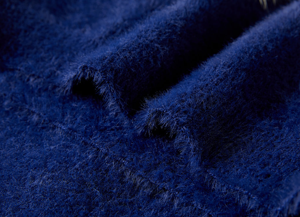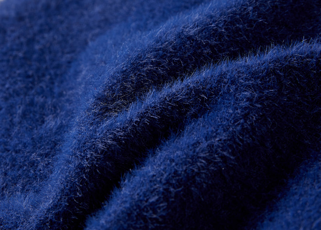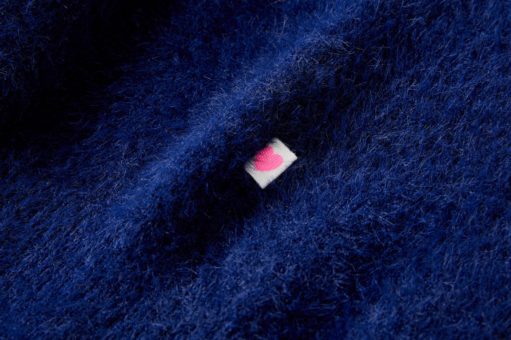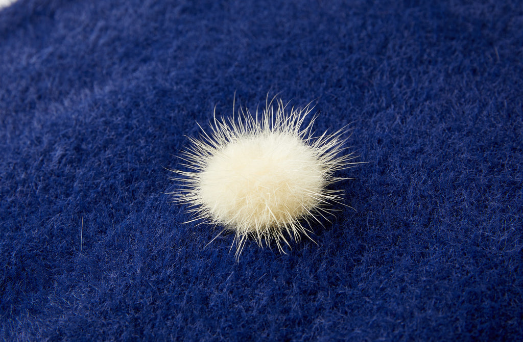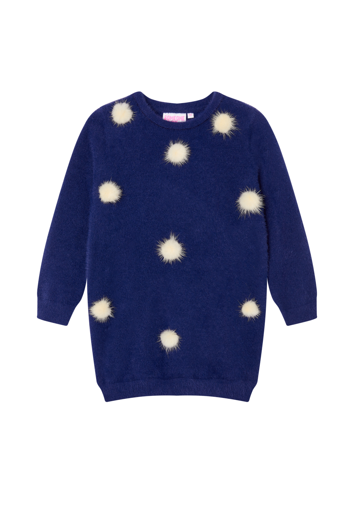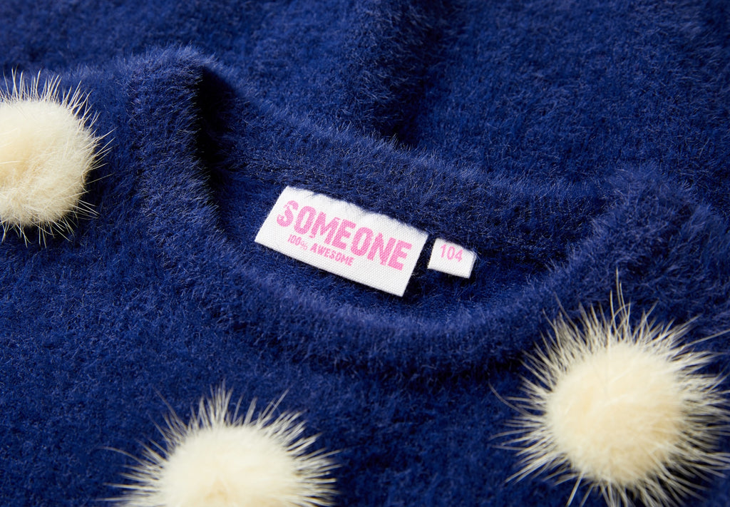 This dark blue sweater stands out with its soft, fluffy pom-poms scattered playfully across the front. The fuzzy details give it a cheerful and cozy look, perfect for colder days. With its long sleeves and comfortable fit, it’s an ideal everyday sweater that blends style with warmth. A charming piece that adds a fun, playful touch to any outfit.
