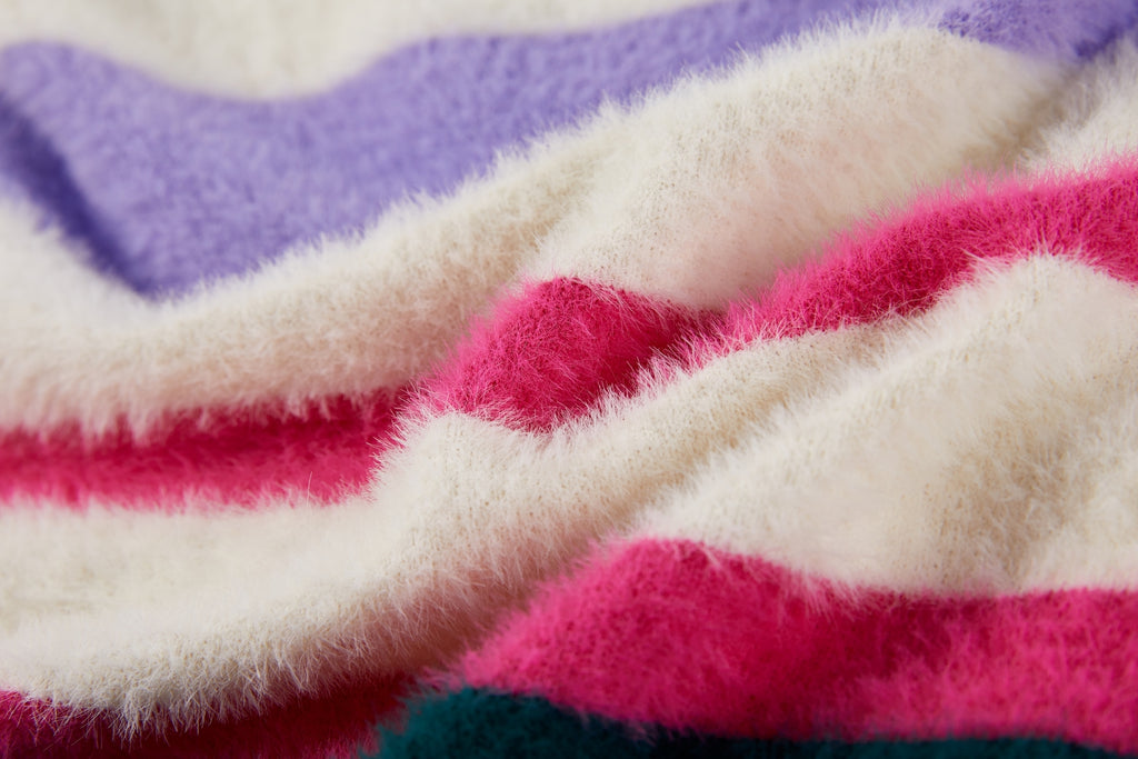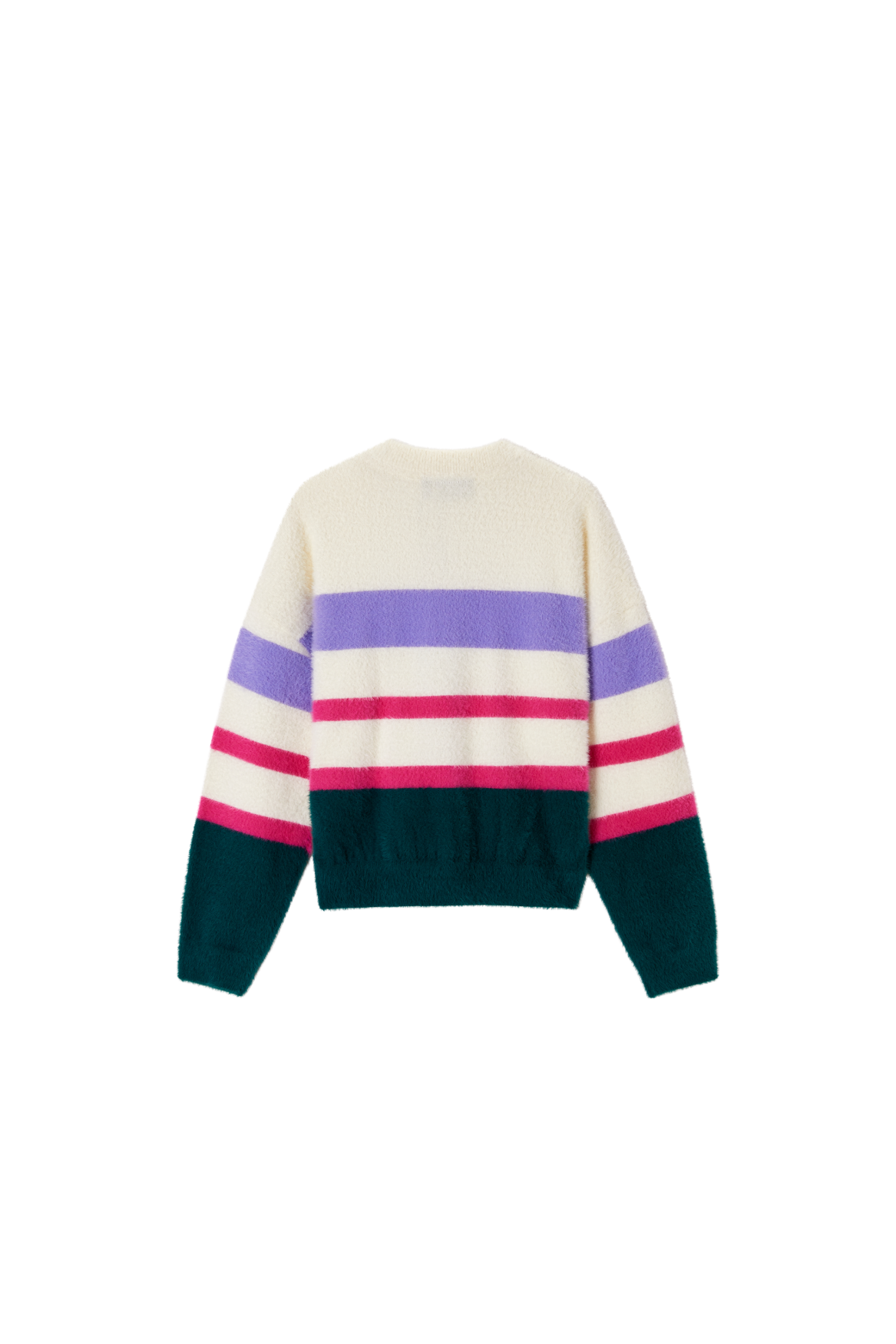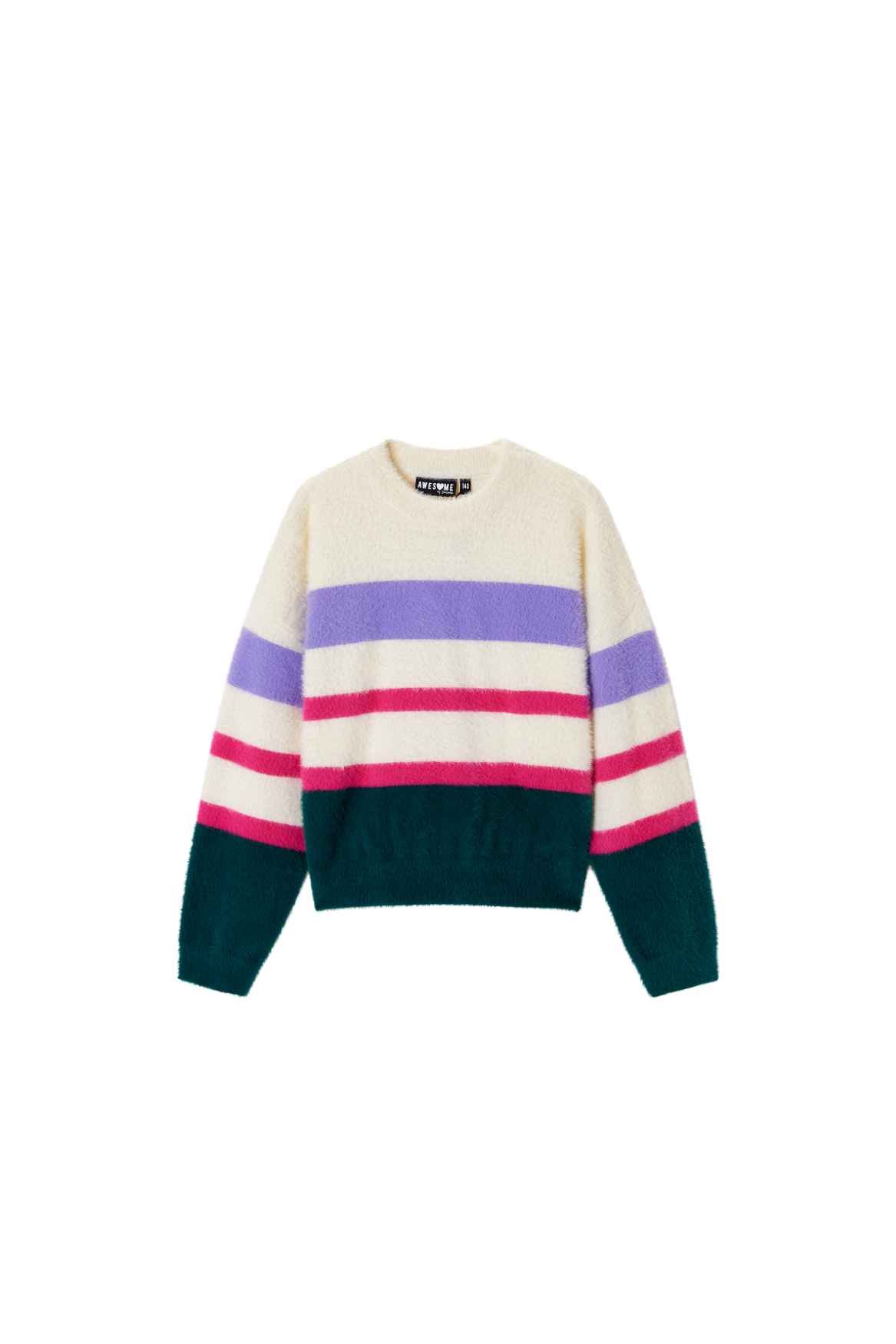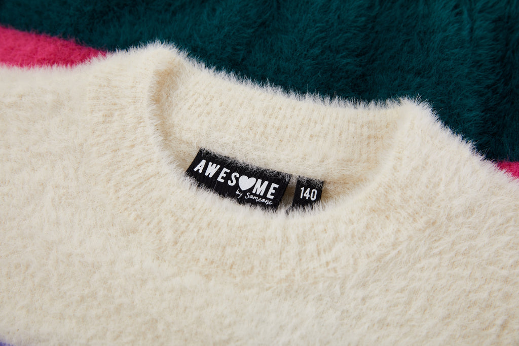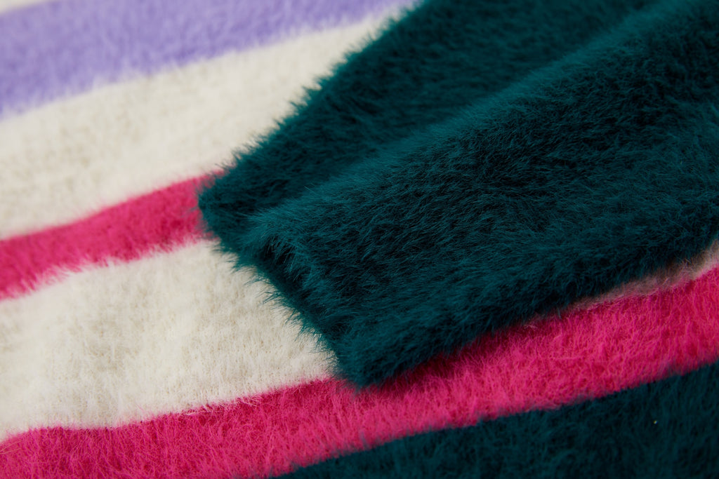 This soft striped sweater is a cheerful and eye-catching addition to any wardrobe. The mix of cream, purple, pink, and dark green creates a playful and fresh look. With its comfortable fit, this sweater is perfect for everyday wear, while the ribbed hems provide a clean and timeless finish. Ideal to pair with jeans, a skirt, or a casual winter outfit for a warm and stylish appearance.