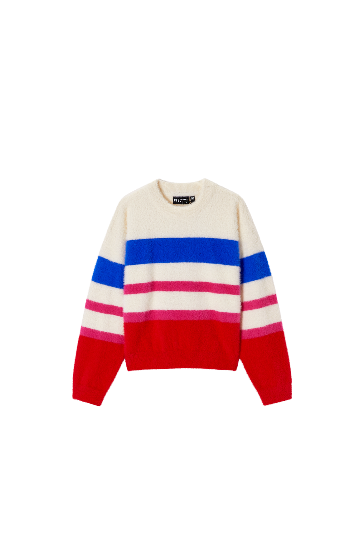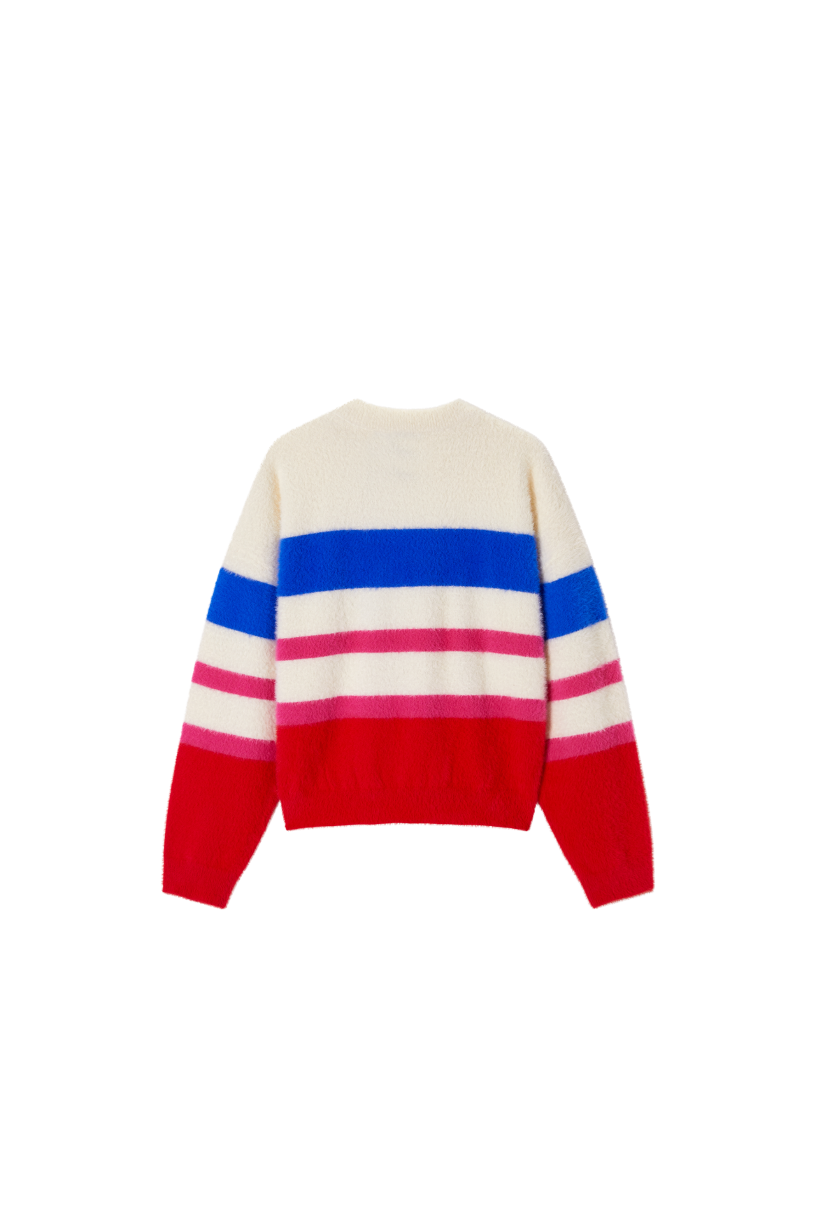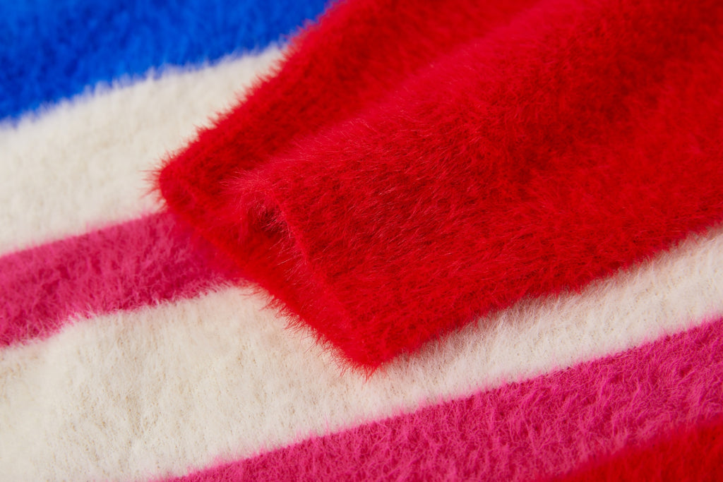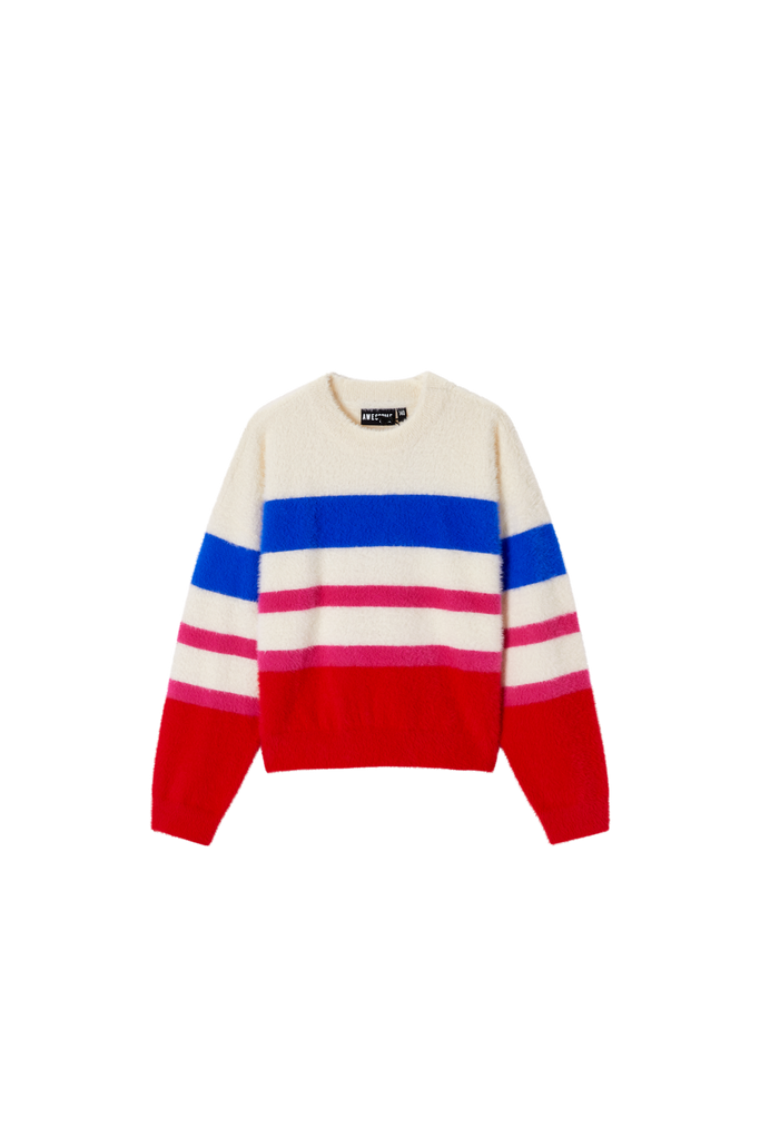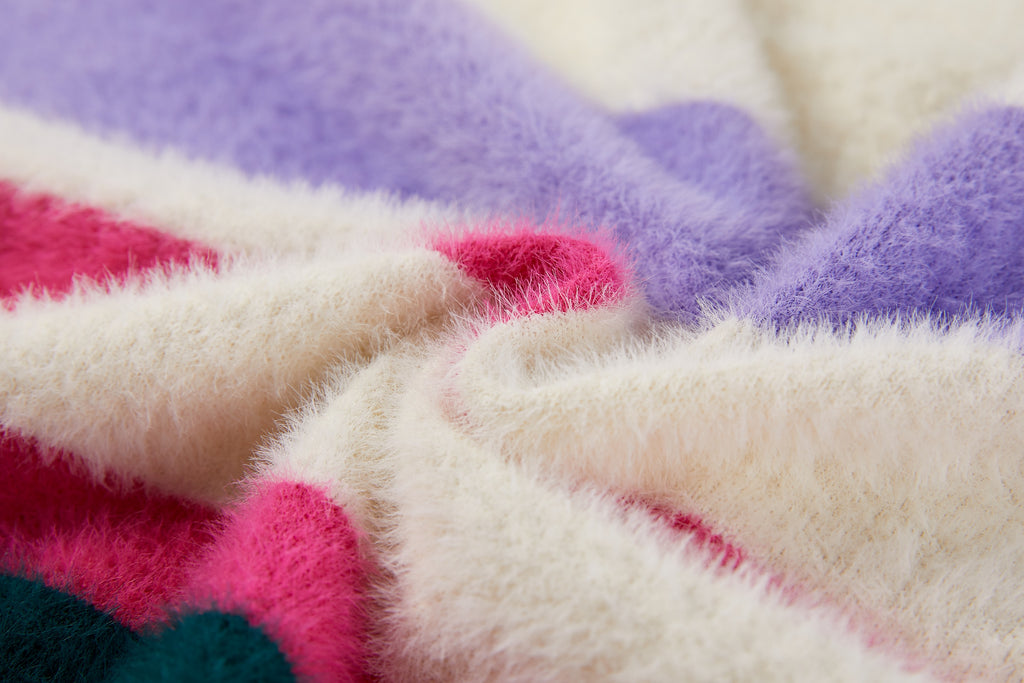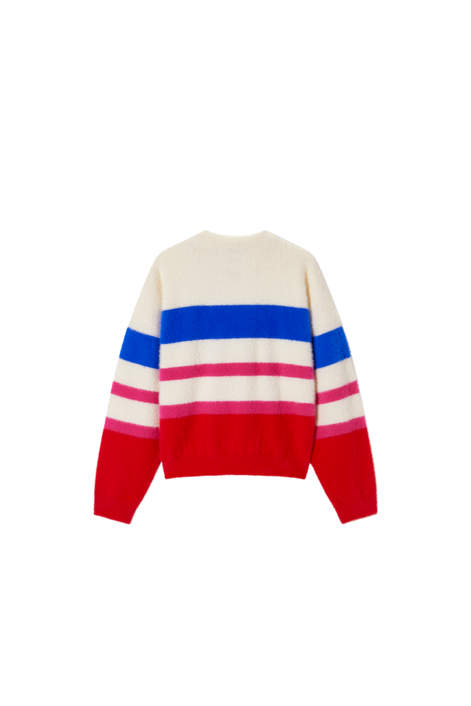 This soft striped sweater is a cheerful and eye-catching addition to any wardrobe. The mix of cream, purple, pink, and dark green creates a playful and fresh look. With its comfortable fit, this sweater is perfect for everyday wear, while the ribbed hems provide a clean and timeless finish. Ideal to pair with jeans, a skirt, or a casual winter outfit for a warm and stylish appearance.