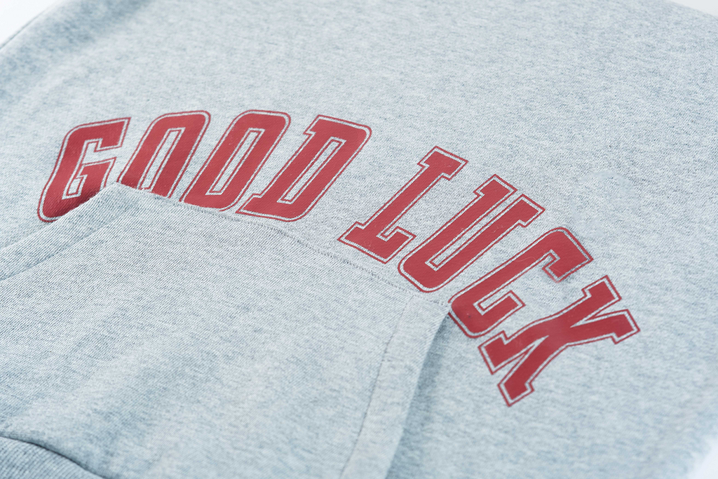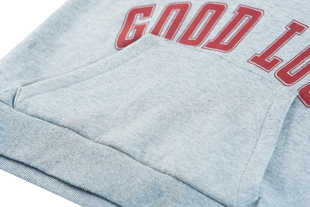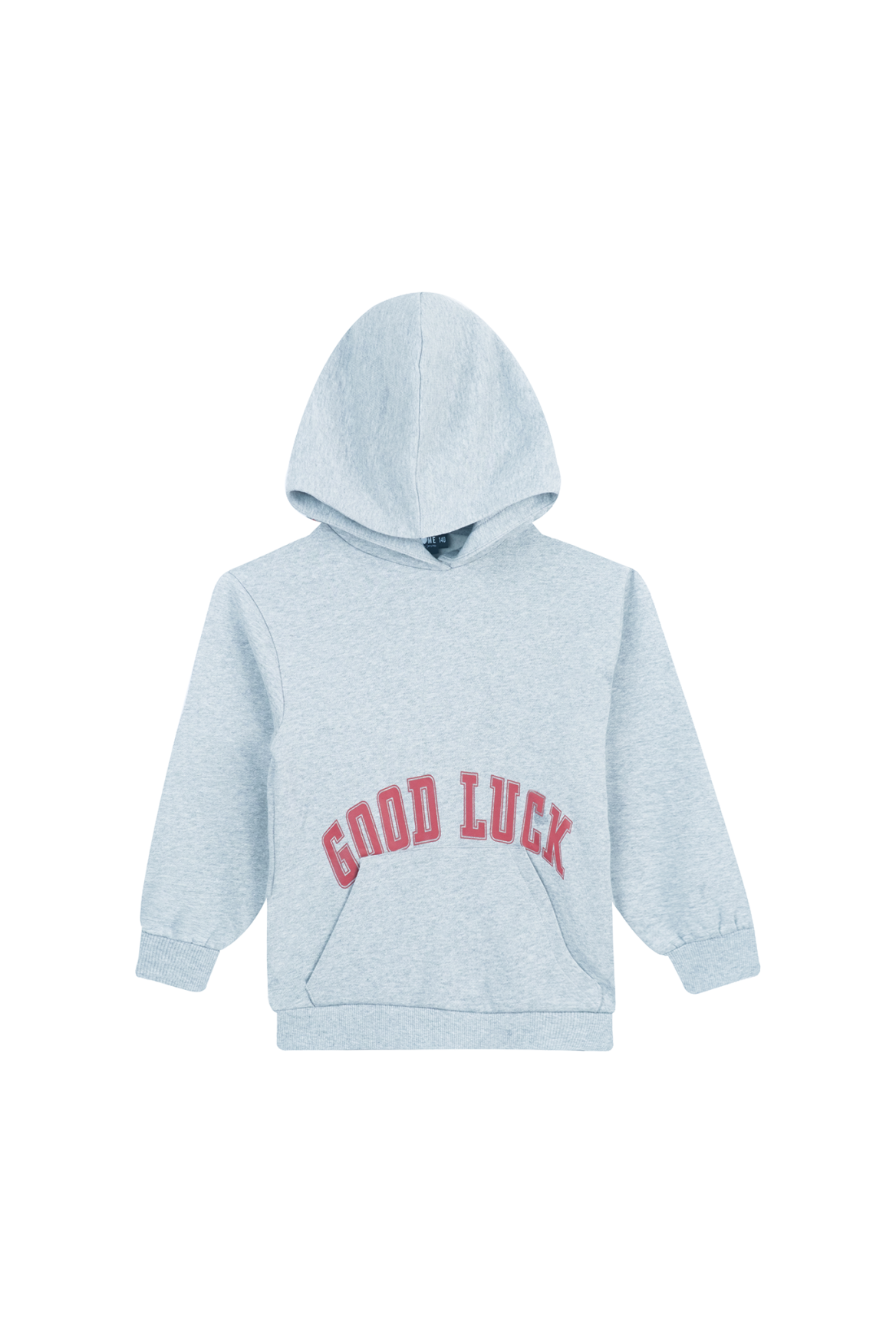 This light grey hoodie featuring the pink GOOD LUCK print is a cheerful and sporty addition to any casual outfit. The curved text adds a playful touch, while the kangaroo pocket and hood provide extra comfort and practicality. Its soft and comfortable fit makes it perfect for everyday wear, whether for school, relaxed days, or a cozy weekend look.