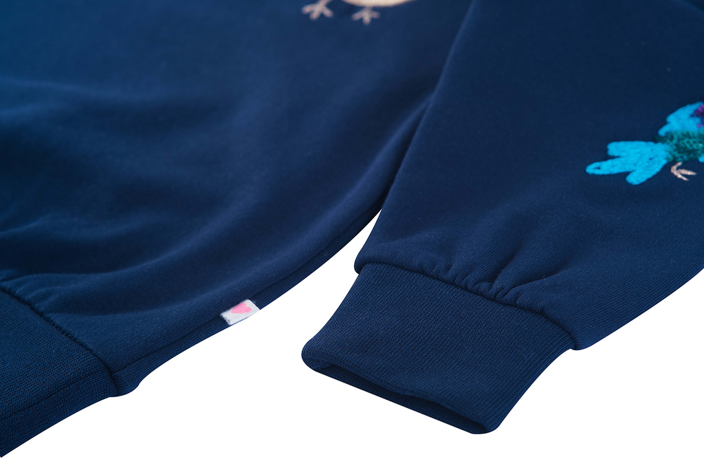 This navy sweater features a sweet bird print on the chest and additional illustrations on both sleeves. The playful bird accents create a cheerful look that instantly stands out. It’s a piece that adds a charming and unique touch to any outfit. The fun detailing makes the sweater suitable for both casual looks and slightly dressier styles.