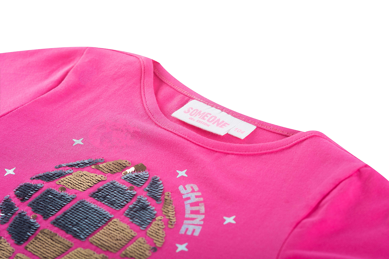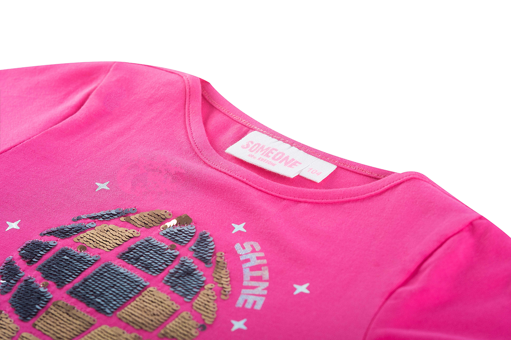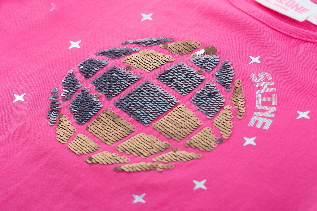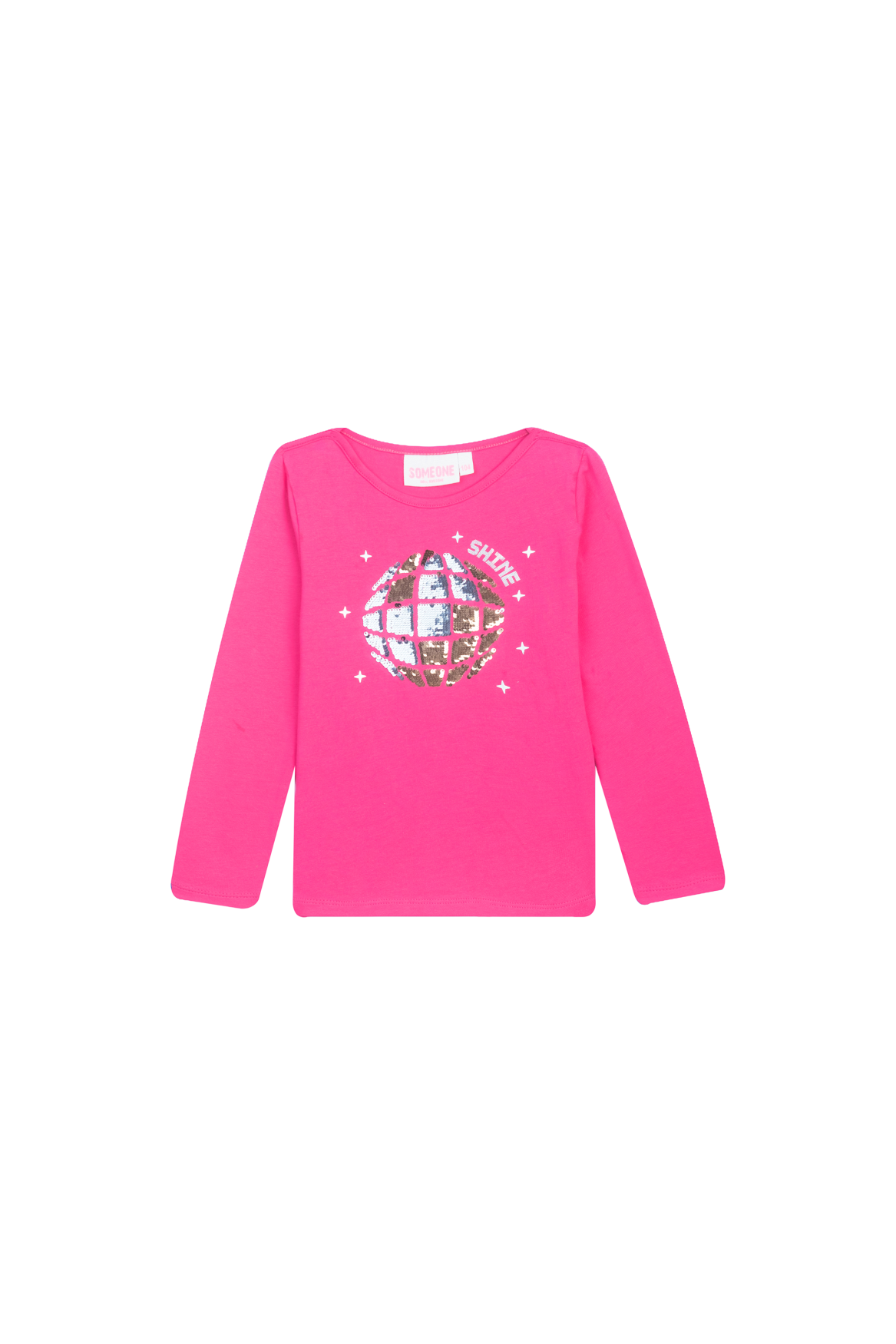 This bright pink long-sleeved top is a true eye-catcher for girls who love color and sparkle. The shimmering disco ball on the front, surrounded by twinkling stars and the word "SHINE", creates a festive and energetic vibe. The design invites dancing, having fun, and letting your personality shine. Perfect for a cheerful outfit at school, a party, or simply a day full of confidence. A dazzling piece that adds a touch of magic to any day.