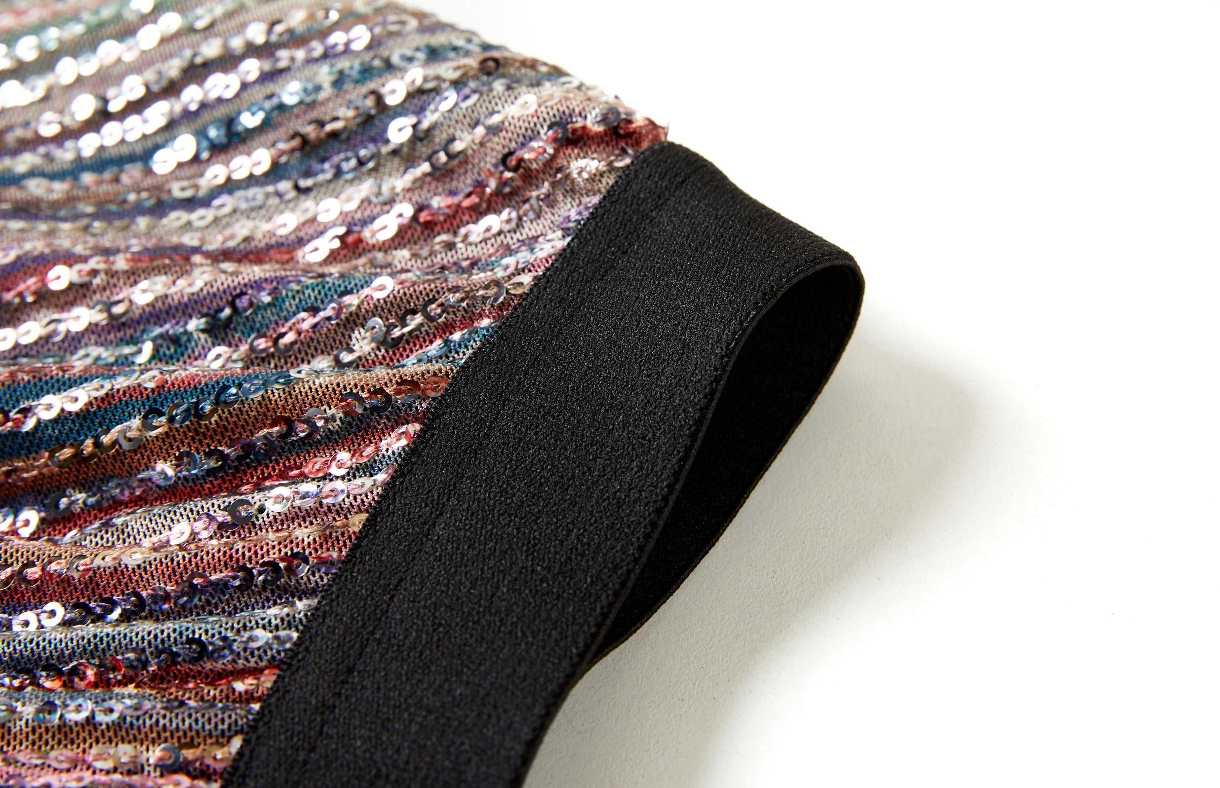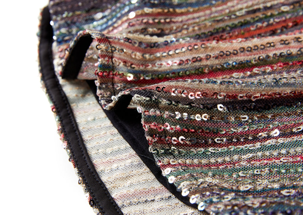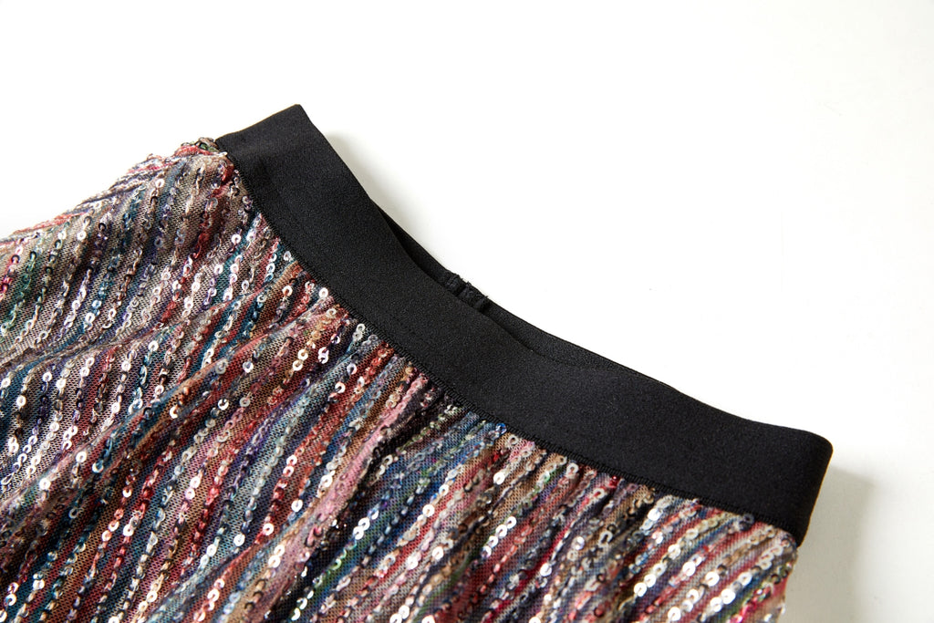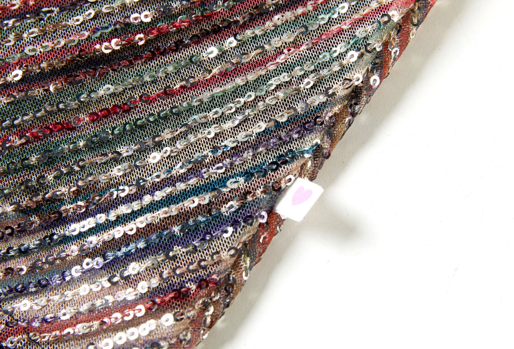 This sparkling skirt is a true eye-catcher with its all-over sequins arranged in colourful striped patterns. The shimmering lines create a fun, festive effect that moves beautifully with every step. The wide elastic waistband ensures a comfortable fit, making it perfect for celebrations, dance parties, or any day that calls for a little extra sparkle. A dazzling piece for kids who love to shine.