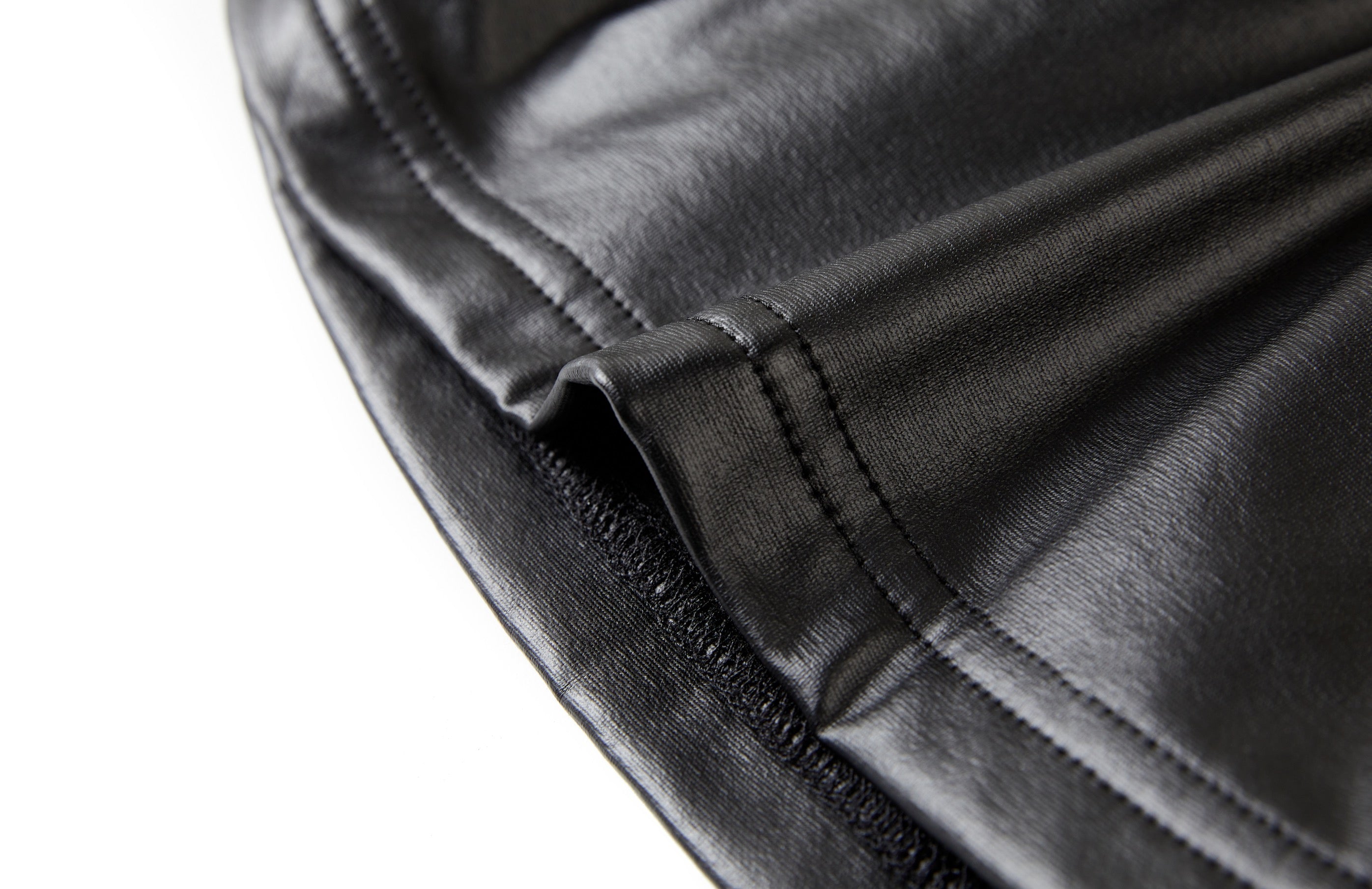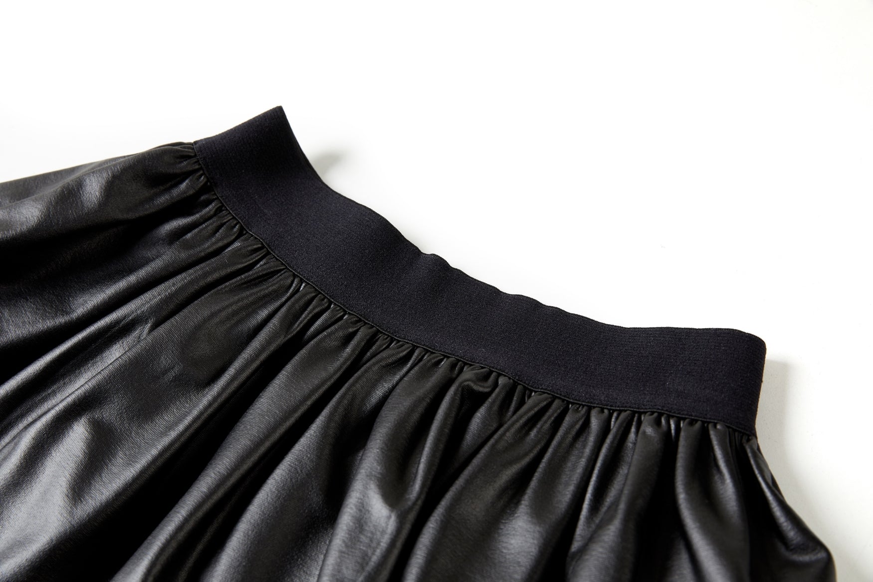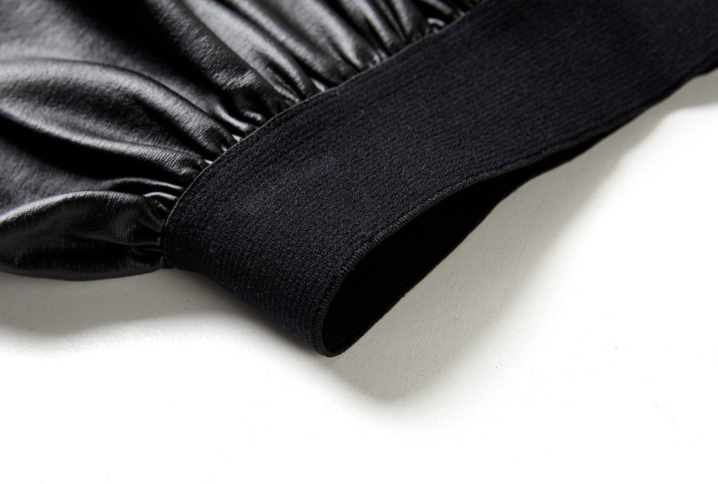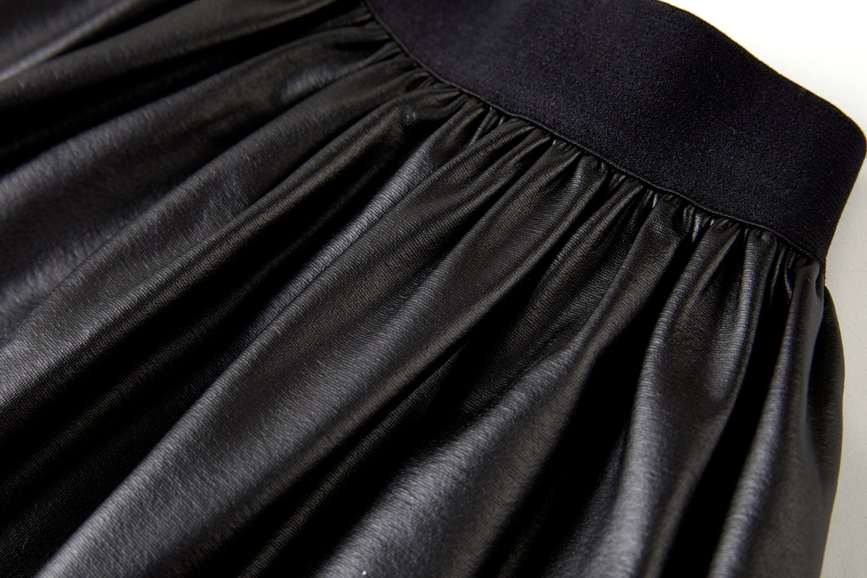 This black skirt features a striking, glossy finish that gives it a cool and trendy look. The soft pleats create a full, flowing shape that moves beautifully. The wide elastic waistband ensures a comfortable fit and makes it easy to slip on. A versatile and stylish piece that can be worn for both casual days and festive occasions.