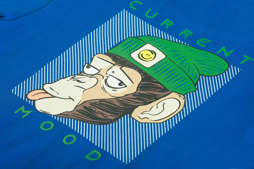 This playful children’s sweater features a standout graphic on the back: a humorous illustration of a monkey wearing a beanie with an expressive look. The “CURRENT MOOD” text adds to the fun vibe, making it perfect for kids with a strong sense of personality. The straight fit and classic crew neckline make it practical for school, leisure time, or relaxed moments at home. A unique and cheerful piece that gives any outfit a quirky twist.