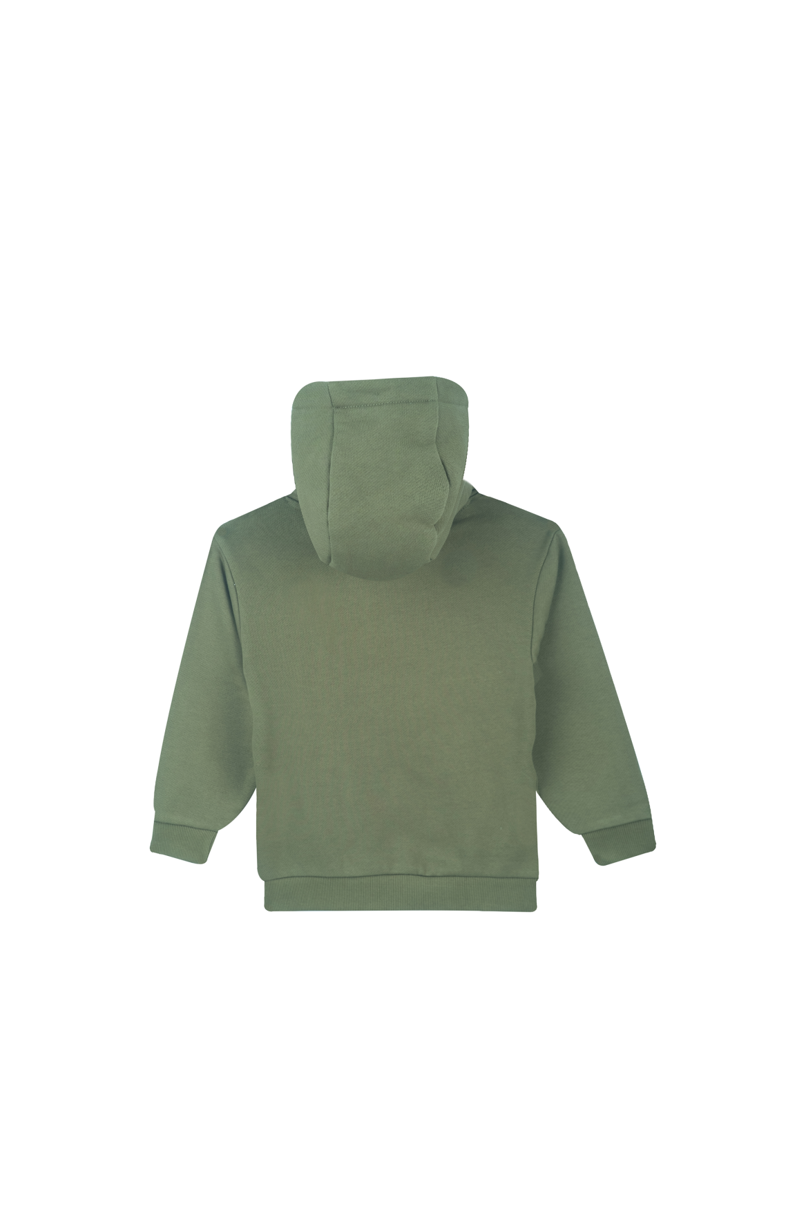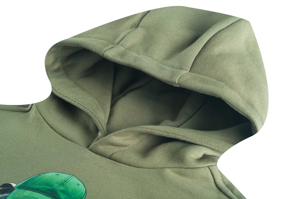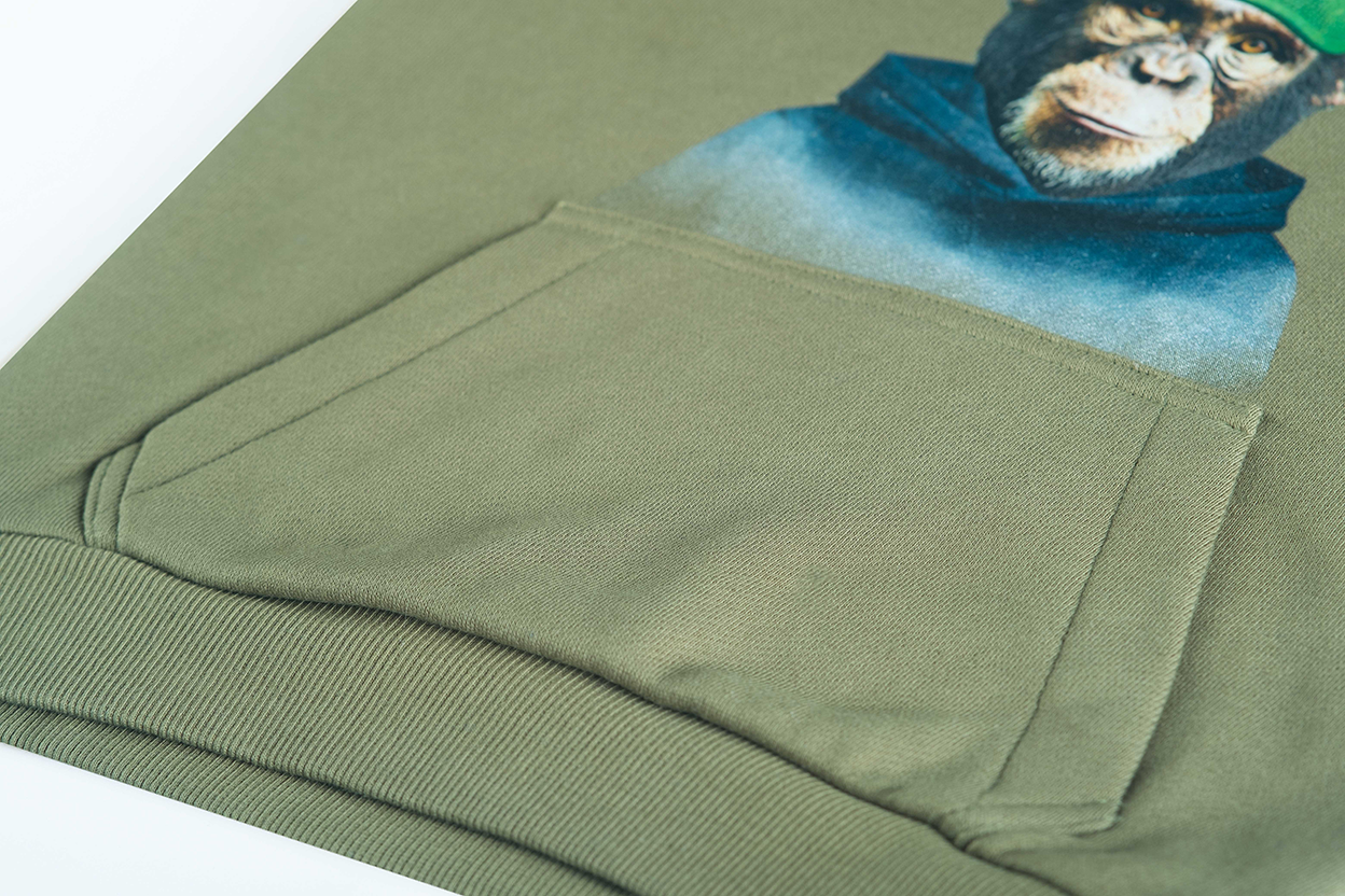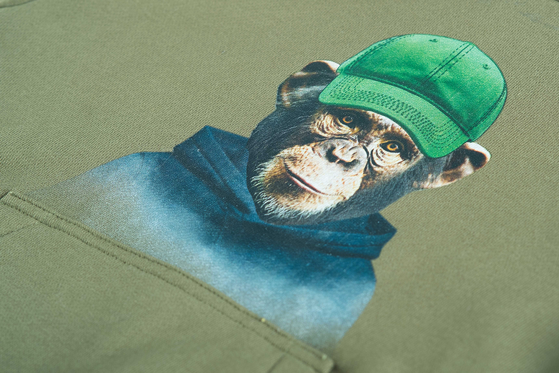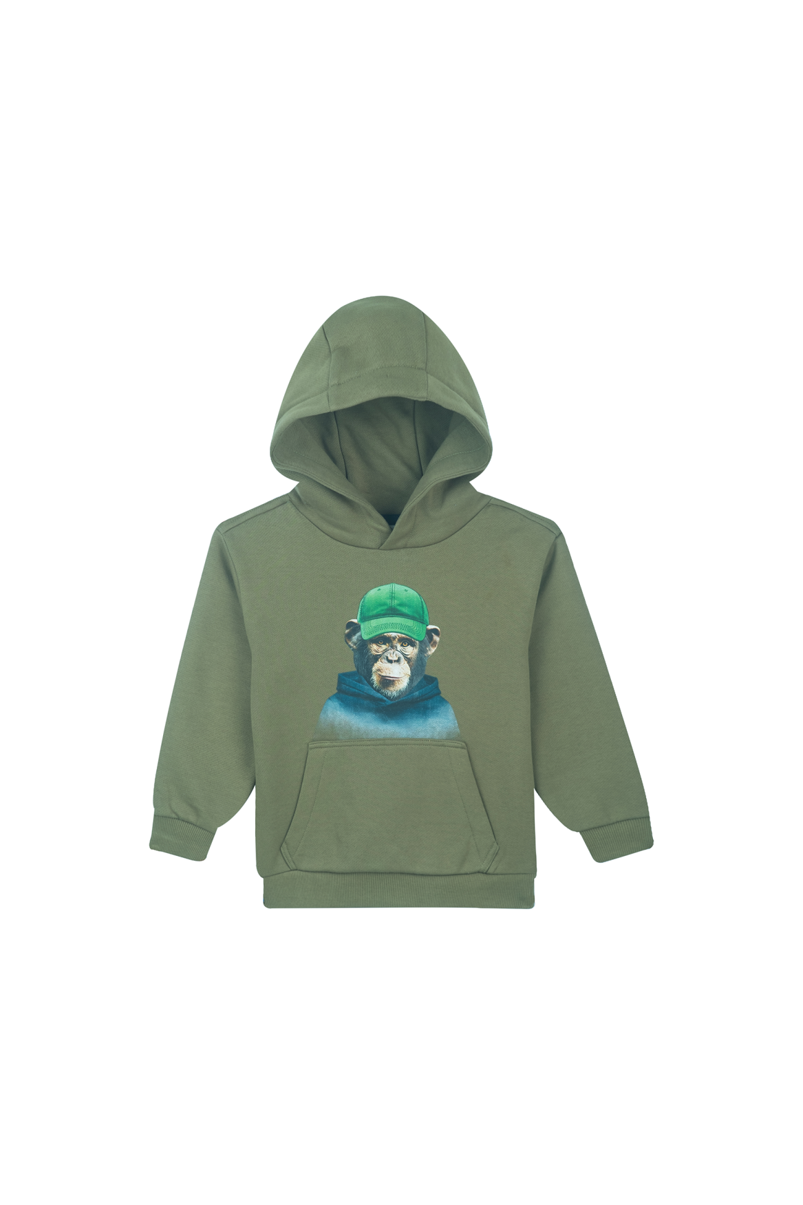 This green hoodie is a playful and eye-catching pick for kids. The chest features a colorful illustration of a chimpanzee wearing a green cap and blue hoodie — a fun and stylish character that grabs attention. The hoodie includes a front pouch pocket and ribbed trims for added comfort. A unique garment perfect for young adventurers with a sense of humor.