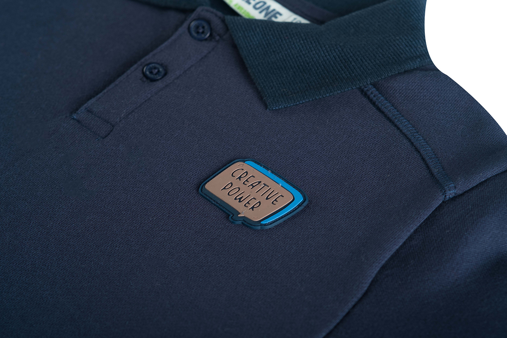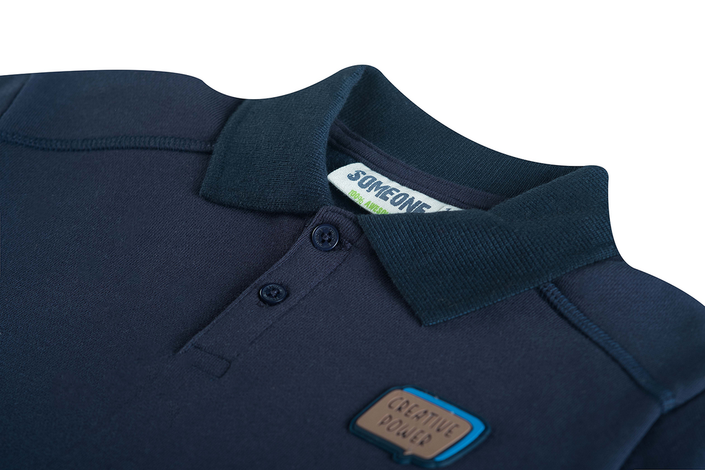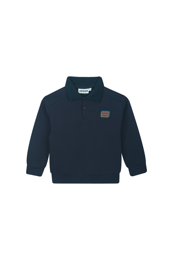 This dark navy polo shirt is a stylish and comfortable choice for kids. It features a classic collar with a three-button placket, ribbed cuffs and hem, and a subtle chest patch that reads “CREATIVE POWER.” The colorful brand label inside the collar adds a playful touch. A versatile piece that works for both smart and casual looks — perfect for young thinkers with flair.