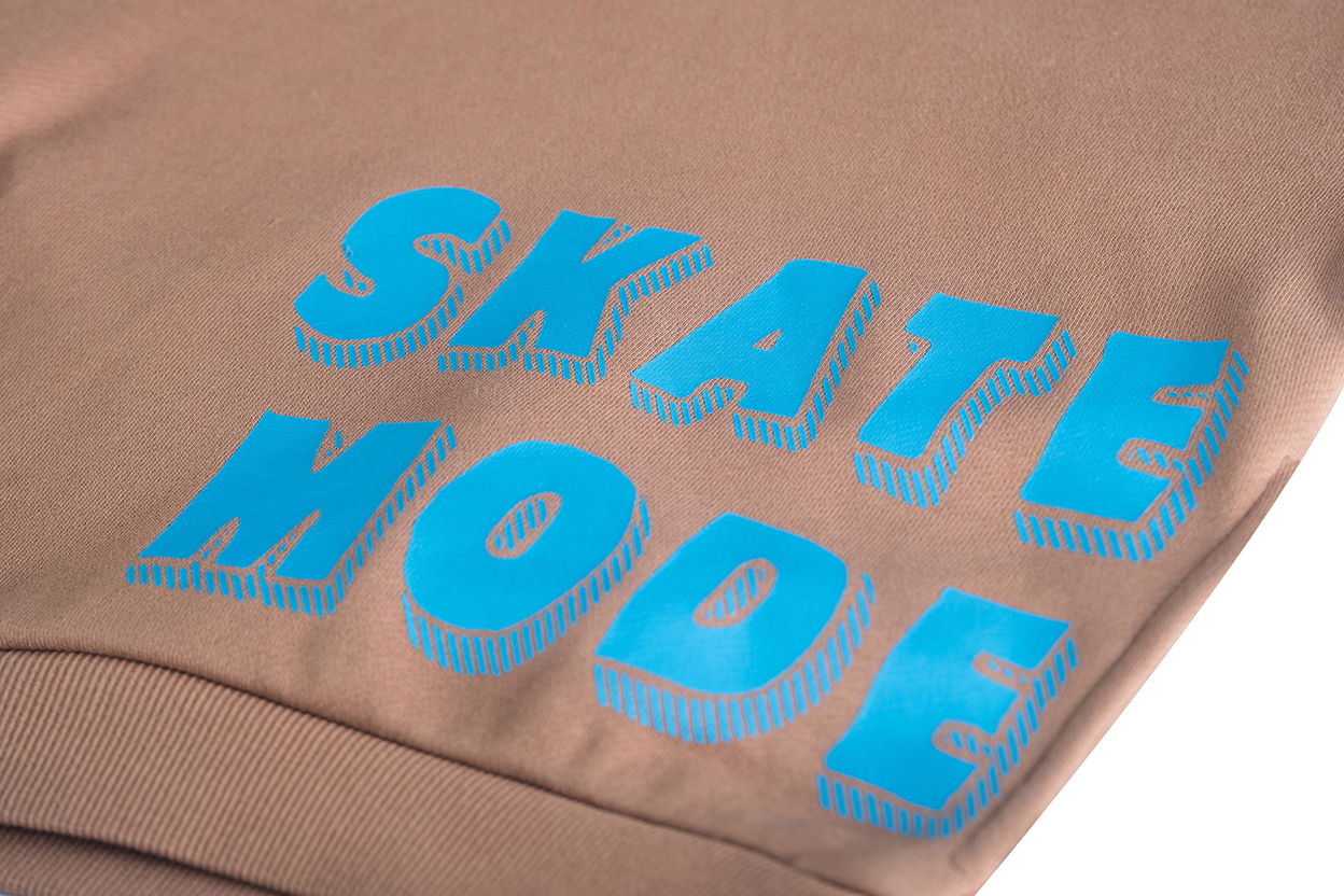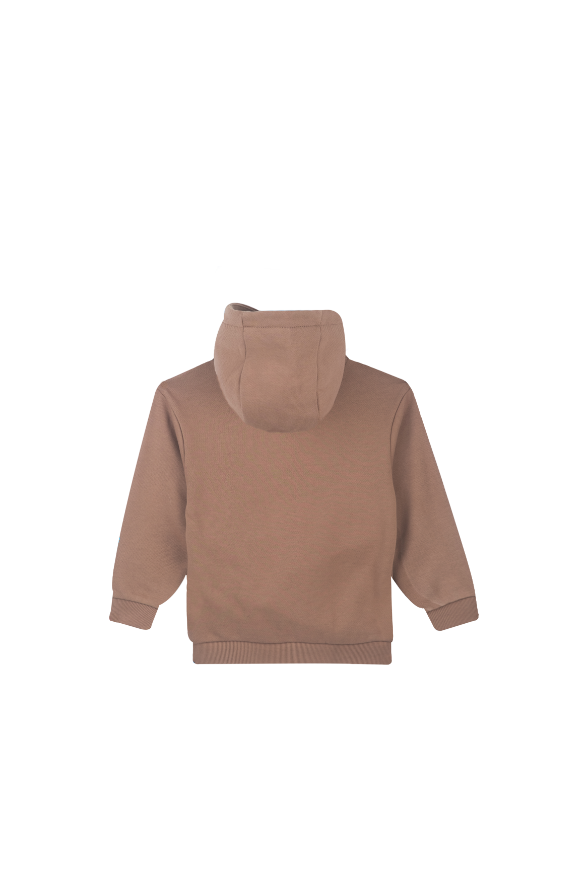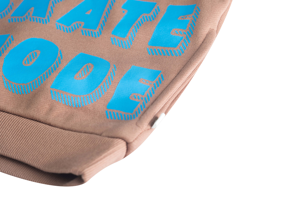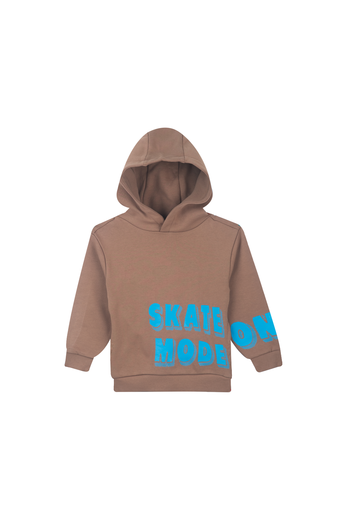 This brown hoodie is a lively and playful addition to any child’s wardrobe. The bold blue text “SKATE MODE ON” stretches across the lower front and sleeve, creating a dynamic and cool effect. The hoodie features a comfy fit with a front kangaroo pocket and ribbed cuffs and hem. Perfect for active kids who love movement and style.