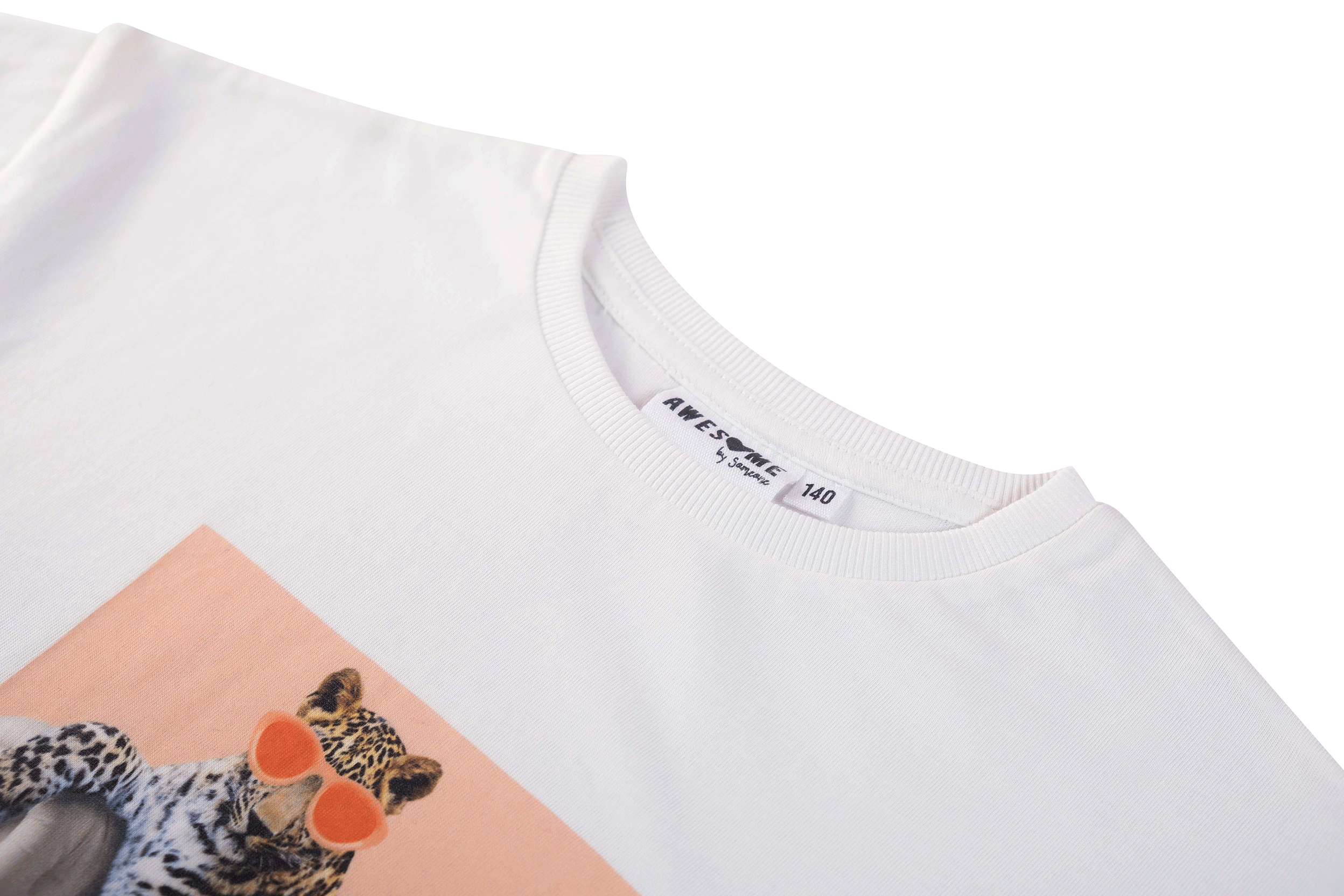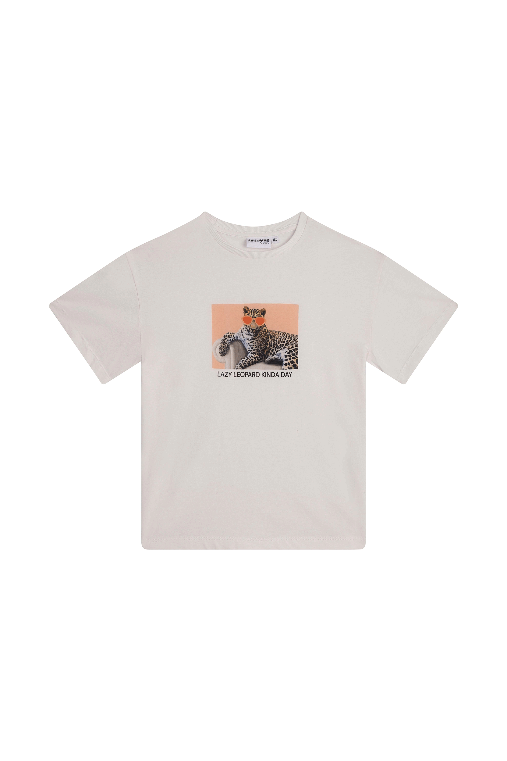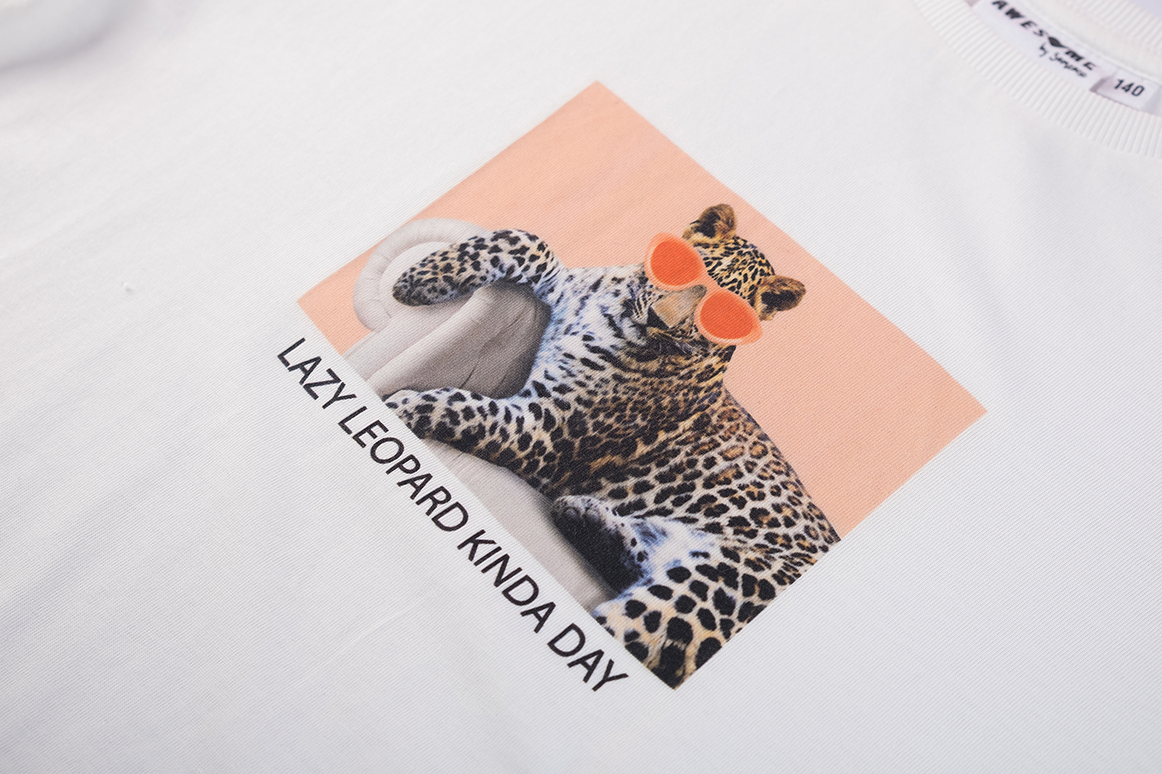 A relaxed T-shirt featuring a fun print of a leopard lounging with sunglasses on. The text “Lazy Leopard Kinda Day” underneath adds a playful, laid-back touch.